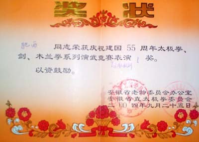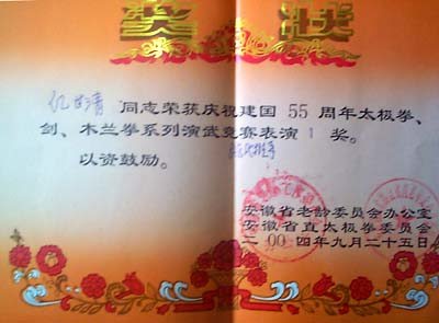 2004年4月带领学生参加洛阳牡丹花会三万人太极拳表演;九月荣获安徽省直太极拳委员会举办的庆祝建国55周年太极拳剑、木兰拳演武竞赛表演陈氏太极剑、老架二路、太极推手一等奖。