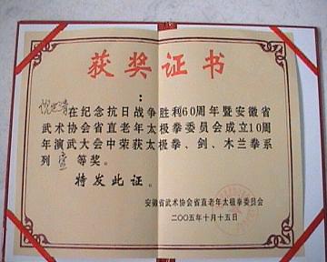2005年8月参加首届“焦作山水杯”国际太极拳DV大赛,荣获太极拳器械一等奖;