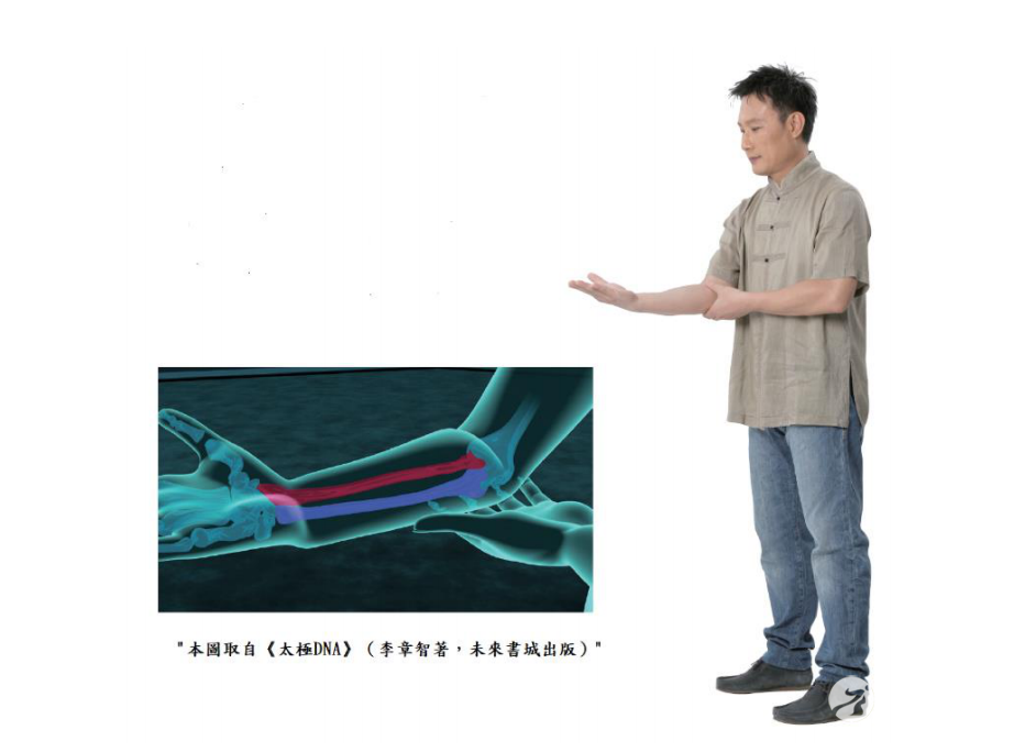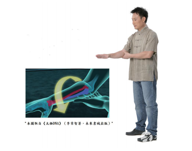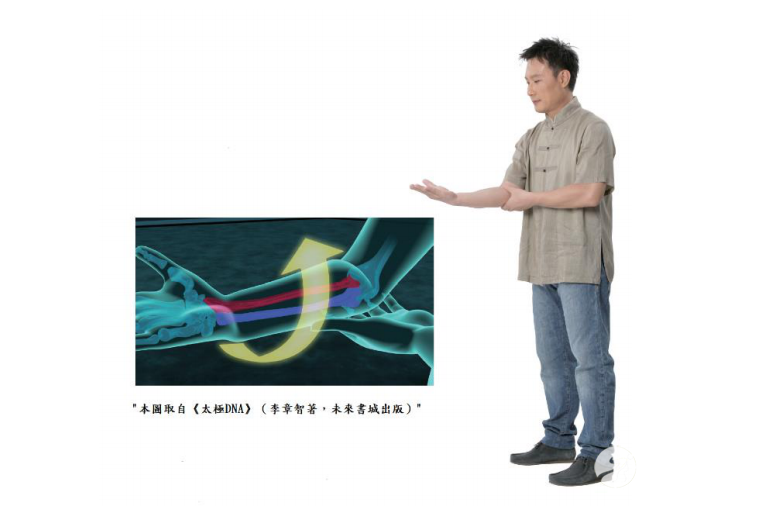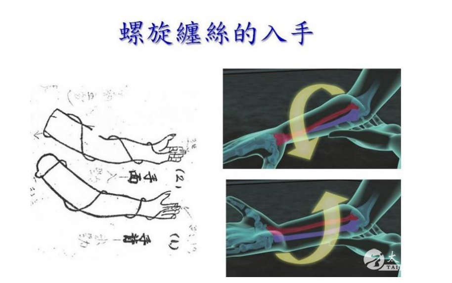 大家都知道「太极」是阴阳相互环绕的图腾,就像两条鱼在水中绕圈游动,白色的鱼代表刚强与积极的「阳」,黑色的鱼代表柔和与顺从的「阴」,阴与阳都不会单独存在,它们以动态的方式进行着相互交替、相互消长,太极的互相消长与循环,是太极拳拳理的重要核心。 陈鑫大师说:「吾读诸子太极圆图,而悟打太极拳须明缠丝精,缠丝者运中气之法门也,不明此,即不明拳。」所以要了解「缠丝」的意义是非常的重要。 三维空间思维 然而由于过往的书籍是二维平面,很难表现出三维空间,因而从图像的角度来看,这阴阳环绕的太极图腾,看似平面的圆圈旋转,实际上的阴阳循环三维空间的呈现线,就不是平面的圆圈旋转,而是立体的螺旋旋转,这个问题也曾在天文学出现过,太阳星系的运行图, 以往以太阳为定点的圆心,九大行星围绕太阳作圆形环绕,但现在发现若是太阳是移动的圆心,那九大行星的移动轨迹就是立体的螺旋缠丝路径。 《陈氏太极拳图说》:「河图实为缠丝精之祖,…即尧典所载:日月运行错综之缠次圆图,…此图专主缠丝劲说,因拳中股肱宜用,故推及之。」而缠丝不仅是在日月运行中,大可至浩瀚无垠的宇宙银河,小至隐藏在细胞中的 DNA 构造中,而且可以发现许多生命的现象也呈现出螺旋缠丝,例如生机蓬勃的藤蔓缠绕,贝壳纹路呈现,甚至细胞中的 DNA 构造。由这些可以归纳螺旋缠丝是生命的运行轨迹,透过符合的运行轨迹的律动可以修补缺陷与完善生命。 同时「螺旋缠丝」,也就是力量透过螺旋的方式推送出去,太极阴与阳的具体呈现,其实宇宙中也有许多类似的结构体,例如宇宙星云的运转,藤蔓植物以盘旋的方式向上生长,台风因为冷、热空气的对流而形成螺旋状的气旋,而这些结构体都因为螺旋的构造,产生了密实的结构,并且发展出惊人的力量和无限生机,同样地,我们也能从太极拳的练习中,体会到这股大自然的神秘力量。螺旋缠丝入手 螺旋缠丝入手 螺旋缠丝的入门,便是从手臂的螺旋感受来,这个动作看似简单,但却是最容易感受到身体螺旋缠丝的呈现,透过前手臂的扭转,感受尺骨与桡骨的开合,体会螺旋缠丝力量的运用,同时细微去觉察在手臂扭转时,由内而外地去感受身体从骨骼、肌肉到皮肤之间拧转的感觉,并且深入观想手臂外层肌肤、毛细孔与空气、能量之间的交互流动。而透过「螺旋缠丝」的训练,能够将气血能量由浅层的肌表深入到深层的筋骨,促使手臂的气血流畅,增加末梢循环,畅通手六经的气血,可以改善手脚容易冰冷的情形与强化手臂骨骼强度。 以具体的招式来说明:「手臂缠丝」 一、首先左手掌心托住右手手肘,右手手掌心朝上,此时右手尺骨与桡骨 是分开的。 二、接着以中指为轴心,向内旋转,此时右手尺骨与桡骨是旋转交叠,宛如麻花状。 三、然后再反向扭转前手臂。 四、如此进行反覆的手臂拧转练习数次,在手臂旋转的过程中,可细细感受骨骼、肌肉到肌肤之间 扭转的感觉。然后换边练习。 在练习时这个动作的时候,可以想象尺骨与桡骨变成两股能量,相互缠绕在手臂中轴,形成一条「中轴能量」,这种练习方式是「骨中行气法」的入门,对于人体能量的有很强大的开发作用。如古书所言「吾读诸子太极圆图,而悟打太极拳须明缠丝精,缠丝者运中气之法门也,不明此,即不明拳。」 螺旋缠丝不仅仅是外在的动作做螺旋动作,更动要的是内在的螺旋,进而形成中气。螺旋缠丝先从手前臂入门,进而到手臂、下肢与躯干,后续再介绍下肢与躯干的螺旋缠丝练习法。 文/李章智 图/《太极DNA》(李章智著,未来书城出版) 本站责编:太极网萌 |
