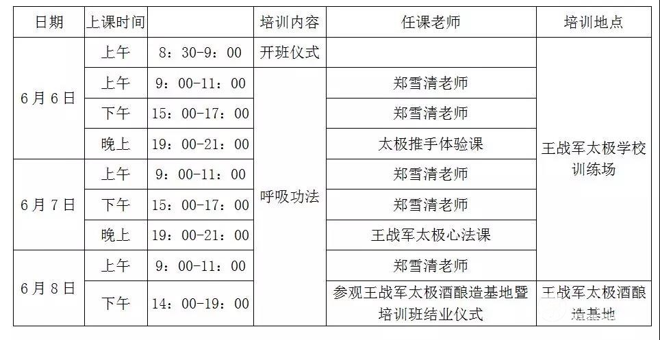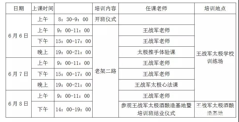 端午节,王战军老师与您相约陈家沟,本次培训分为《老架二路讲劲、拆招》、《王战军太极呼吸功法》两个班,报名时请说明班级。 培训时间:6月6日—6月8日 培训内容 课程1:老架二路 陈式太极拳老架二路又称炮捶,由陈家沟陈式第十四世祖陈长兴,在祖传太极拳的基础上,精炼归纳编定而成。 老架二路以采、挒、肘、靠等手法为主,以掤、捋、挤、按为辅,具有快慢相间,刚柔相济的太极拳风格,同时与陈式太极拳老架一路相比,发劲、跳跃较多,重复动作较多,总体偏快,但拳架身形、发劲要领等与一路一脉相承。 培训老师:王战军 培训内容:老架二路拆拳、讲劲、正架。 培训费用:3980元 课程安排: 课程2:王战军太极呼吸功法 王战军太极呼吸功法:太极拳是以丹田为核心的阴阳拳,是呼吸之间的运动。 古语云:“精有主,气有元,呼吸元气,合与自然,此之谓也。”所以,呼吸功法是王战军太极非常重要的内功心法。学习正确的呼吸方式,在吐故纳新的呼吸中调养身心、从而达到阴阳平衡的状态。 端午仲夏,放慢脚步、放下烦忧,来跟随郑雪清老师一起,享受呼吸之间的快乐… 培训老师:郑雪清 培训内容:王战军太极呼吸功法 培训费用:3980元 课程安排: 重要信息 一、报到时间: 6 月 5 日全天报到。 二、报到地点: 温县陈家沟王战军太极学校 三、培训时间:2018年6月6日—6月8日 四、招生对象:广大太极拳爱好者 优惠政策 凡报名者,须连续转发三天培训班消息到朋友圈集够 88 个赞,并同时转发10个微信群,方可享受以下各级别优惠政策: 一、学员 300 元/人;弟子、王战军老师的师兄弟优惠 600 元/人。 二、王战军太极协会理事、监事、各分会会长、王战军太极学校名誉校长带领团体报名三位以上(不含本人),本人可以享受免学费。 三、王战军太极协会理事、监事、大区总会会长、分会长、王战军太极学校名誉 校长的同行人员均可享受 600 元优惠。 (以上优惠不可叠加使用) 福利:5 月 25 日起,参训学员可提前到王战军太极学校免费学习。 联系我们 一、报名电话:13782830876 王老师 二、微信报名: 三、汇款方式: 账号:6217908000007073122 户名:王祺斌 开户行:中国银行温县支行 备注: 1.食宿费自理。推荐:学校宾馆双人间: 100元/间/天,陈家沟王廷酒店:158 元/间/天。餐费:100/人/天 2.学校订房电话:13782830876 王老师 陈家沟王廷酒店订房电话:0391-8377666 五、特别说明: 1.汇款后请电联或微信告知,同时请将您的身高体重告知报名老师。 2.提前报名,请勿空降,谢谢合作。 3.温馨提示:端午节期间为出行旅游的高峰期,参加培训班的学员请一定要提 前订往返票,方便出行。 乘车路线 1.郑州火车站下车后到对面汽车中心站乘坐到温县的汽车,至温县汽车站下车,从温县汽车站到温县王战军太极学校打的20元。 2.郑州东站高铁站下车打车到郑州花园路汽车北站约35元,然后乘坐到温县的客车,至温县汽车站下车,从温县汽车站到温县王战军太极学校打的20元。 3.郑州机场包车电话:13782830876(260元)直接送到目的地。 4.郑州市区到温县拼车电话:13782830876(50元),直接送到目的地,需提前预约时间、地点。 5.郑州市区到温县包车电话:13782830876(200元),直接送到目的地。 往期培训回顾 王战军老师、郑雪清老师将在“十一”黄金周期间举办2019年第二次的培训班,培训内容为老架一路及王战军太极三式呼吸功法,有意者可提前报名呦! 责编:太极网豪杰 |