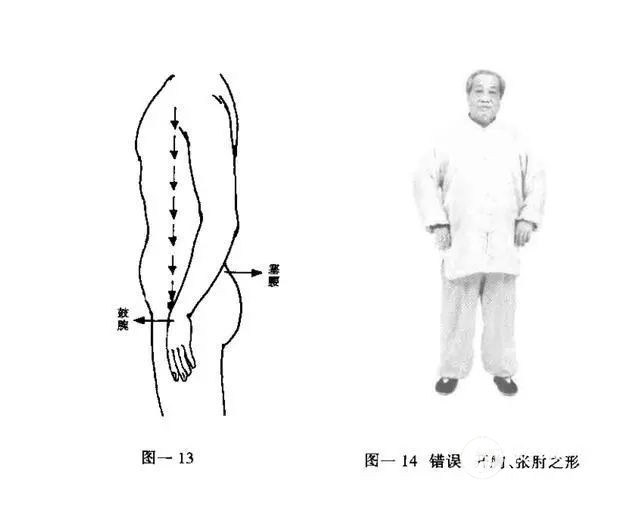 塞腰、鼓腕是当内气下行至腹部后,内气向腰胯四周弥散催发而引起的腰部向后依偎、位于胯两侧的两腕向外圆展的态势(图一 12、13),以上完全是以意领内气运行引致的身形变化,绝非单纯的形体动作。如果单从形体上去表现开胸、张肘,势必会导致紧张不适的翘肘、耸肩之弊。(图一 14)