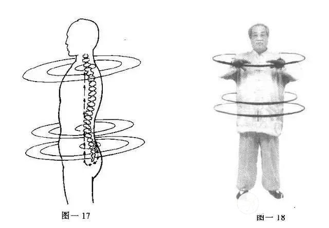 转经臀后向命门流注,再下行至尾间(图一 16),继而由下向前上翻转沿尾椎前侧向上运行至胯间,遂以意气的上行线为中心,以意引领内气向胯四周圆散出直径约 1 米的胯气圈;同时胯气圈中心的内气仍继续上行至腰间,圆散出直径约 80 厘米的腰气圈;腰气圈中心的内气继续上行至胸。上方,再向四周圆散出直径约 1 米的肩气圈。(图一 17、18)