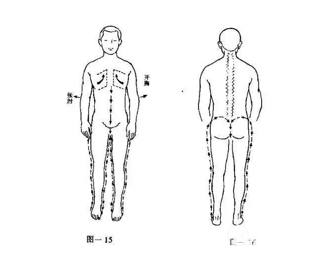 开胸、张肘、塞腰、鼓腕的意气运行过程是:意想胸部犹如两扇门,门中间下端夹着一块小石子。当用意将门向身后两侧推开之际,会有一种心胸豁然开朗之感。与此同时,小石子直坠腹中,丹田内犹如静水投石,激起道道水圈向四外漫延鼓荡。当内气荡至身后时,腰向后塞的动作便随之而生,继而当内气荡向两旁时,又会促使两腕外拥鼓起;而后内气继续下行至裆间分向两腿内侧前三分之一处向下涌流,经膝内侧、小腿内侧、踝内侧至涌泉,复由踝外侧、膝外侧向胯两侧上行涌流(图一 15)。
