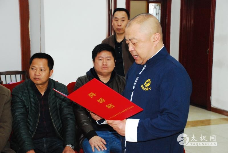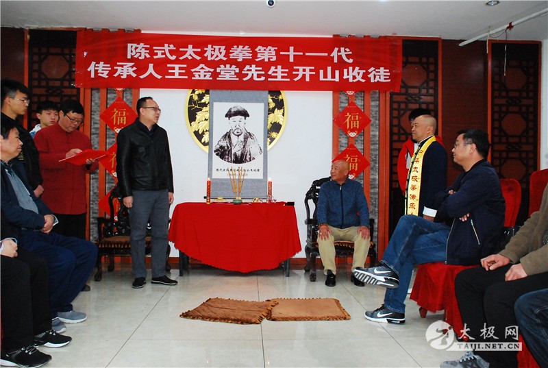 王金堂收徒仪式现场 (太极网 开封报道)2019年3月30日,陈伯祥大师弟子、陈式太极拳第十一代传承人王金堂开山收徒,收徒仪式于开封举行。太极拳爱好者魏江辉在众人见证下正式拜入王金堂老师门下,成为开山大弟子,正式肩负起弘扬太极精神,传承传播太极拳的责任。