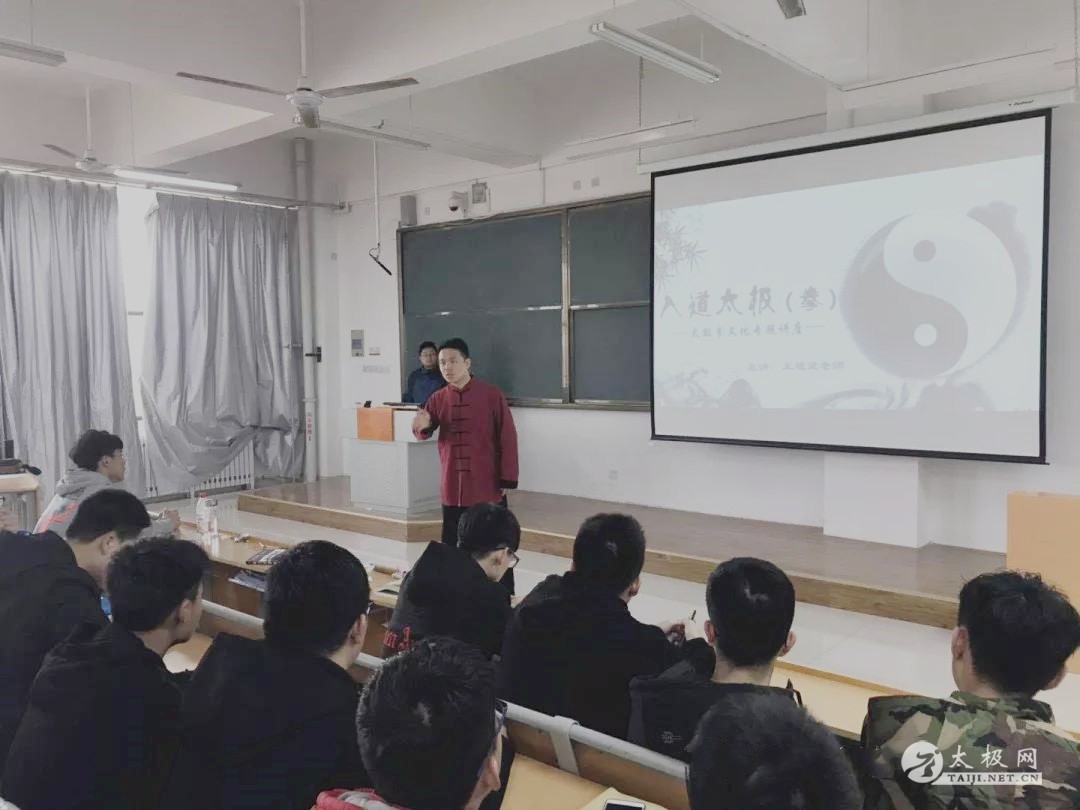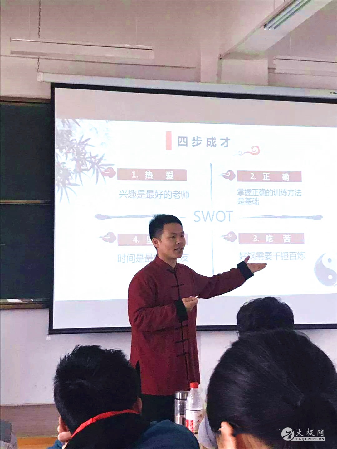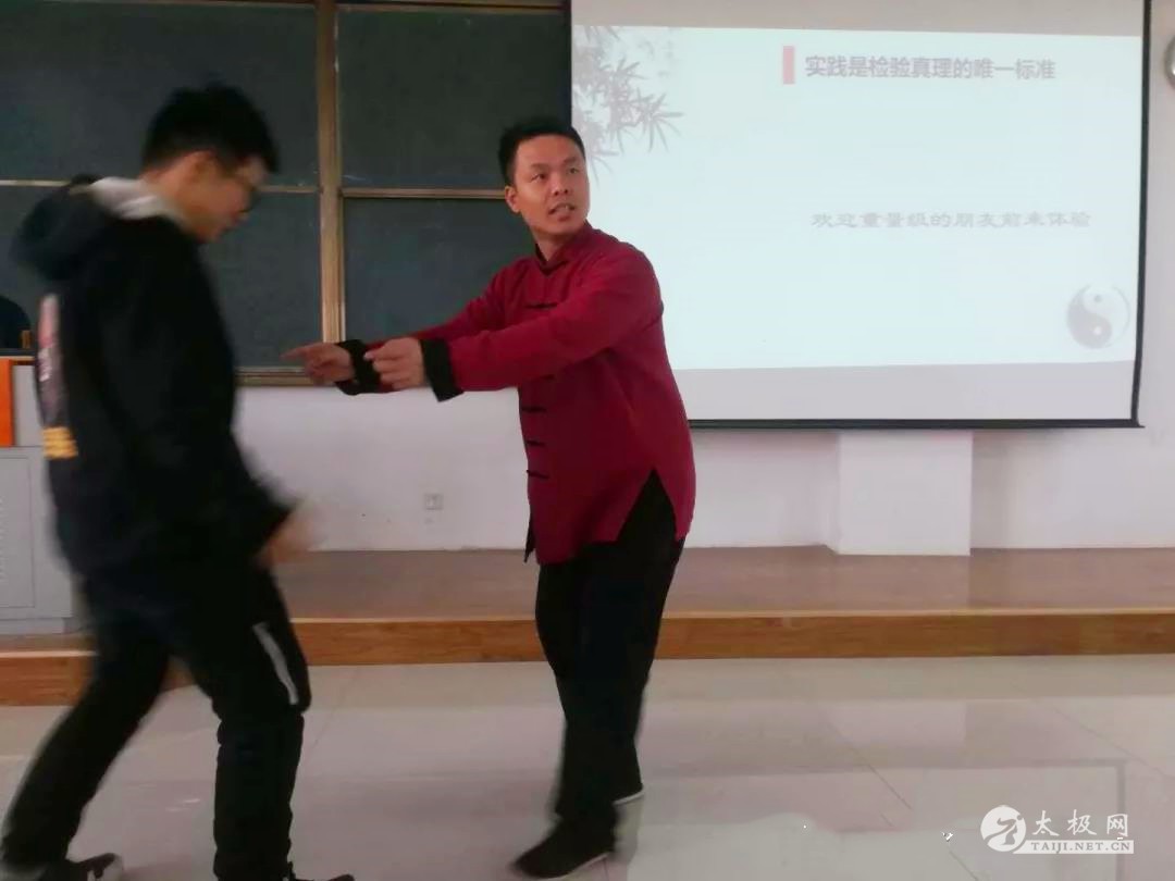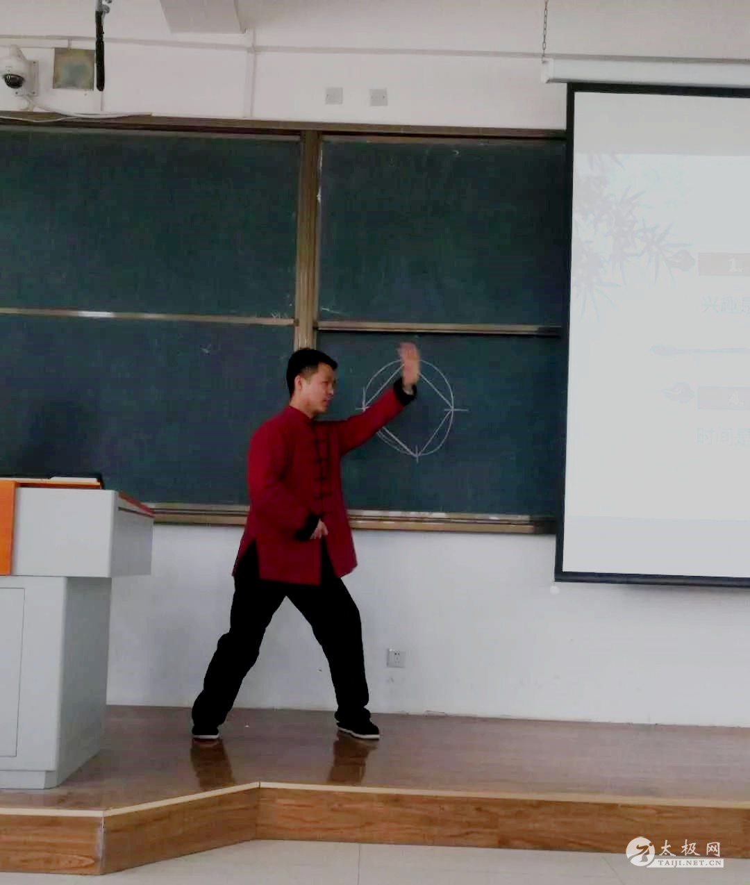 还没有正式开课,已经有100多名学生来到多媒体教室。校体育部副部长刘立伟首先介绍了开展本次讲座的目的和意义,王旭望老师从何为太极?什么是太极拳?练习太极拳的意义到底在哪里?如何才能练好?等几个方面做了详细介绍。 王旭望老师在为同学们讲解太极拳 在讲座过程中邀请了几位同学亲身体验,在场的学生们为之一震,一改对太极拳的固有印象,加深了对太极拳的理解。 王旭望老师为同学们展示太极拳实用技法 最后,在同学们的强烈呼吁下,王老师现场展示了一段太极拳套路,现场掌声雷动,“入道太极”太极拳文化系列讲座取得圆满成功。 王旭望老师为大家展示太极拳 本站责编:张欢 |
