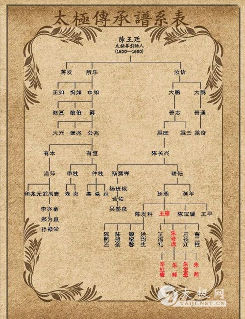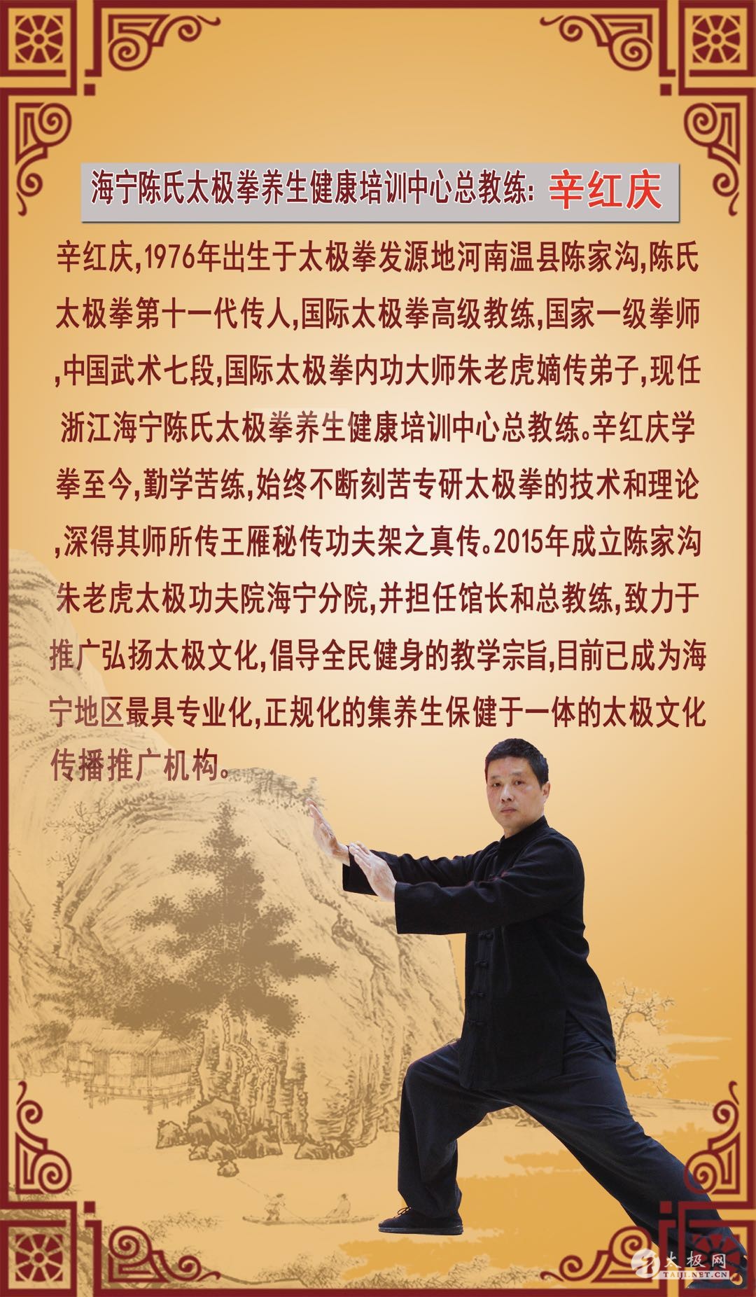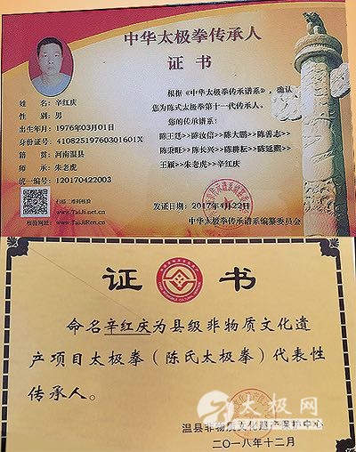 辛堂村毗邻陈家沟,拳风旺盛,练拳者众。生长于此,辛红庆耳濡目染下受到拳术氛围的影响和周边太极文化的熏陶,自幼便喜好太极拳。随年龄增长,他逐渐展现出过人的资质。15岁那年拜入朱老虎先生门下,学习陈氏太极拳传统功夫架,从此与太极拳结下不解之缘,于太极之道奋勇前行。 太极拳传承谱系表 辛红庆中华太极拳传承人证书 其师朱老虎先生师承“老四大金刚”之一的王雁宗师。拥有“神靠铁捋”之称的王雁宗师,一生淡泊守定,不为名利,育人无数。朱老虎先生得王雁宗师言传身教,练拳十数年,一招一式尽得真传,习得一身绝技。在王雁宗师谢世后,朱老虎先生开始走南闯北,闯荡江湖。直到50岁知天命之年,走遍了大半个中国,未逢敌手。辛红庆拜师后,听闻师父和师祖的事迹,敬慕之情油然而生,立誓习师门真传,承师门传统。