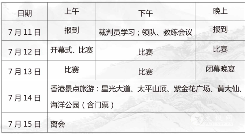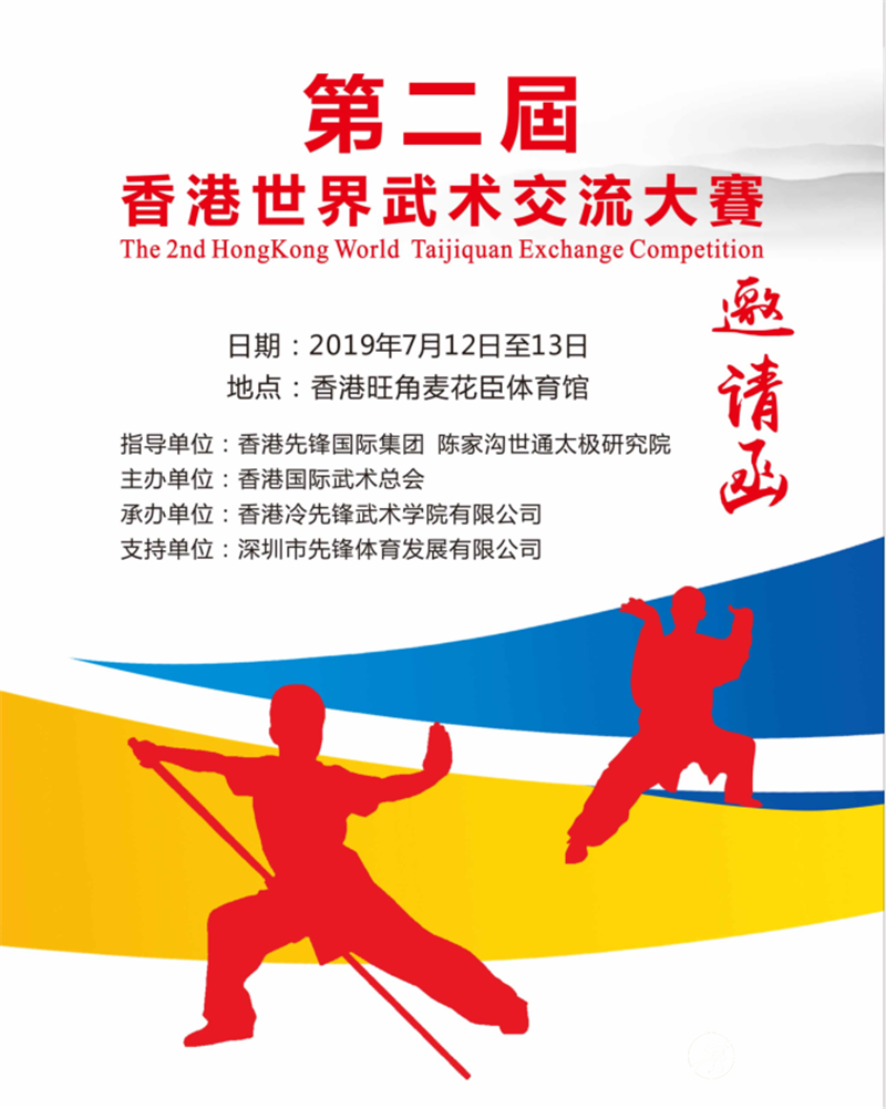 日期: 2019年7月12日至13日 地点:香港旺角麦花臣体育馆(旺角奶路臣街38号) 指导单位:香港先锋国际集团 陈家沟世通太极研究院 主办单位:香港国际武术总会 承办单位:香港冷先锋武术学院有限公司 支持单位:深圳市先锋体育发展有限公司 太极网 一、比赛项目 (一)武术套路类(包括各流派的拳术、器械的个人和集体项目)。 (二)健身气功类(五禽戏、六字诀、易筋经、八段锦、马王堆导引术、导引养生功十二法、太极养生杖、大舞等)。 二、参加办法 (一)各国家、地区武术协会、社团组织、健身气功组织、大专院校、武术馆校、中老年人体育协会、青少年活动中心、健身俱乐部、中小学、幼儿园、街道小区和武术爱好者均可组队或个人参赛。 (二)参赛队可报领队、教练各1人,队医1名,运动员男、女人数不限。 (三)每位运动员参加项目数量不限(项目分类表内所有项目均可选择) (四)集体项目要求报4人(含4人)以上。 (五)武术个人全能:报单项达3项(集体项目除外)以上即为个人全能,3项中须含徒手和器械项目。 (六)团体总分:代表队中参加个人全能比赛运动员前15名(不分性别)的最好成绩,即可计算团体总分。 (七)参赛人员均须签署《安全责任声明》 (八)大赛设“全球武术贡献奖”,对参加达30人、50人和80人以上选手参加本届大赛,有特殊贡献的组织或个人进行表彰,评出一、二、三等奖,颁发奖金、奖杯和证书。 (九)参赛者可入围评选本届武术名家、武术神童奖、武术耆英奖、最佳代表队、最佳领队、最佳教练、最佳运动员、最佳裁判员等奖项。 (十)中国大陆赴港申请方法:报名参赛人员必须办理赴港证件《港澳通行证》, 方可出入香港海关。 ( 1)持往来港澳通行证,签注上注明"F、 Q T、S. D”签注者前往香港,无需办理报关手续。 (2) 签注上注明"L”签注者,为团体旅游签证者,过关时还需办理报关手续。 (3)办理《港澳通行证》时间越早越好,一般通行证有效期为5年,每年在赴港前二个月去办理签注即可。有些地区办证需要参赛邀请函的,可及时与组委会联系。 三、竞赛办法 (一)本次比赛为个人单项赛、集体项目赛、个人全能大奖和团体总分大奖赛。 (二)竞赛规则采用国家体育总局武术运动管理中心审定的《传统武术竞赛办法》、国家体局健身气功管理中心审定的《健身气功交流展示竞赛评分方法与标准》和本规程及各目竞赛规程的有关补充规定。 (三)套路竞赛年龄分组: 1. 儿童组( A组): A1组: 6岁以下( 2014年1月1日以后出生) A2组: 6-7岁( 2012年至2013年间出生) A3组: 8-9岁( 2010年至2011年间出生) A4组 : 10-11岁( 2008年至2009年间出生) 2. 少年组(B组): B1组: 12-13岁( 2006年至2007年间出生) B2组: 14-15岁( 2004年至2005年间出生) B3组: 16-17岁( 2002年至2003年间出生) 3. 青年组(C组): C1组: 18-24岁( 1995年至2001年间出生) C2组: 25-29岁( 1990年至1994年间出生) 4. 中年-组(D组): D1组: 30-34岁( 1985年至1989年间出生) D2组: 35-39岁( 1980年至1984年间出生) D3组: 40-44岁( 1975年至1979年间出生) 5. 中年二组(E组): E1组: 45-49岁( 1970年至1974年间出生) E2组: 50-54岁( 1965年至1969年间出生) E3组: 55-59岁( 1960年至1964年间出生) 6. 老年组(F组): F1组: 60-64岁( 1955年至1959年间出生) F2组: 65-69岁( 1950年至1954年间出生) F3组: 70-74岁( 1945年至1949年间出生) F4组: 75-79岁( 1940年至1944年间出生) F5组:80岁(含)以上( 1939年12月31日以前出生) (四)运动员年龄、健康状况均由各代表队自己审核,以报名单上盖章,或签字后确认。如因年龄不实,一经查出则取消该运动员竞赛资格。竞赛期间因健康情况而引发的伤病等,均由各单位和个人自行负责,经费自理。参赛运动员请自行办理好“人身意外伤害保险”。 四、各项目此赛时间规定 1. 任何单练项目完成套路的时间为40秒至4分钟(不包括健身气功)。太极类演练至3分钟时,由裁判长鸣哨提示(原套路内容较多,可将套路进行删减;凡太极拳竞赛套路、规定套路从起势起至3分钟鸣哨声后即可准备收势,未完成部分可删除,不予扣分。 2. 集体项目完成套路的时间不得超过4分钟。 3. 健身气功项目类的时间(包括个人和集体)不得超过6分钟。 五、项目配乐规定 集体项目可自行配音乐。 六、集体项目参赛年龄组别 按报名参赛队员的平均年龄确认组别(不分性别) 七、服装,器材要求 参赛选手必须穿武术及各类功夫服装参加比赛和表演,服装器材由选手自备。 八、录取名次 (一)个人项目按不同的套路、年龄、性别分别录取前8名。 (二)集体项目按各项目分类编号、分年龄小组分别录取前8名(不分性别)。第1至8名分别颁发奖杯、奖牌和获奖证书,第8名后颁发优秀表演奖。 九、现金大奖奖赏办法 (一)个人全能大奖: 个人全能大奖:个人全能选手不分国家和地区, 个人全能奖金:冠军获港币3000元,亚军获港币1500元,季军获港币800元,第4名至第6名各获港币300元;第1至6名颁奖杯和获奖证书。 (二)总团体大奖: 1. 总团体大奖名额:总团体不分性别、年龄组别,不分国家和地区,设总团体冠军、亚军、季军、第4名至第6名,共6个获奖团体名额。 2. 总团体奖金:冠军获港币5000元,亚军获港币3000元,季军获港币2000元,第4名至第6名各获港币1000元;第1至6名颁奖杯、个人奖牌和团体获奖证书。 (三)计分办法: 1. 个人全能成绩计算方法:每个参加个人全能大奖赛的选手,不管参加几项单练项目的拳术和器械,以参赛项目中得分最