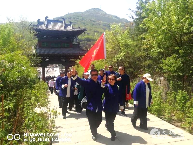课堂休息期间大家也顾不上休息,抓紧机会互相交流新学到的知识,并围着刘太多老师请教各种问题。 接着范老师针对杨氏太极拳三十七式的每个动作的要点展开深入教学,要求把从《打手要言》中新学的知识带入到三十七式中进行练习,让大家更深入的体会每个动作。 再次课堂休息后先由刘太多老师给大家演示了新编的杨氏太极拳二十四式,精彩的演示让大家掌声不断。然后范老师对每个动作要点进行了详细的讲解,大家对新编套路都很有兴趣,非常认真地学练起来。第一天的学习大家收获满满,也更加期待接下来两天的旅游教学。 5月2日是弟子培训班的第二天,早上8点大家便在工人文化宫前集合,一同乘车前往山西省太山龙泉寺进行旅游教学。 在路上靠边停车休息时,大家原本只是想下车活动活动身体,缓解一下坐车的疲劳。却一起在路边练起基本功,并打了一遍新编杨氏太极拳二十四式。果然对大家来说打拳就是一种很好的休息方式。而且即使在停车休息期间,大家也不忘抓紧机会向范德治老师和刘太多老师请教各种问题。 由于五一交通拥堵,在11点才到达太山龙泉寺。虽然感觉有些疲劳,但印入眼帘的是头顶蓝蓝的天空和远处山上满眼的绿色,美丽风景让大家停不下脚步,劲头十足的向山上攀登。