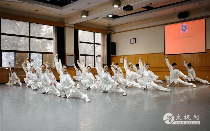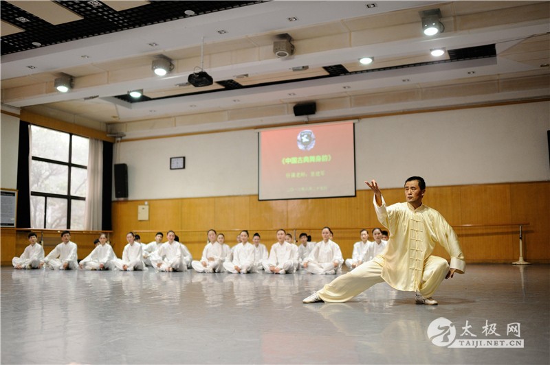 太极拳与古典舞教学之我见 本人从事太极文化研究和太极拳教学30多年,从2003年开始,在北京舞蹈学院、中央民族大学、解放军艺术学院古典舞专业和编导专业指导学生学习太极拳套路和功法。本人结合在高校太极拳教学实践和研究,谈谈自己的一些体会。 一、中华太极文化对太极拳教学的意义 我认为中华太极文化是太极拳教学的灵魂和统帅。在给古典舞专业学生和编导专业学生教授太极拳时,必须要把太极拳之根源--太极文化的哲学思想梳理清楚,阐明中华太极文化与太极拳的关系,这是教好太极拳的基本前提和必要前提。 1. 中华太极文化是中华民族母文化,哲理思辩的核心是追求人与自然和人与人的和谐统一 何为太极?(易﹒系辞上)曰:“易有太极,是生两仪,两仪生四象,四象生八卦,八卦生吉凶,吉凶生大业。”太极是派生万物的本原。太极文化源于周易,古体的易就是日月的结合,易字本身就包含了阴阳概念的内涵。它体现了阴阳两个方面的对立统一思想。而始祖伏羲氏创立了太极和八卦。并以古太极图为标志,精辟的论述了宇宙的阴阳之道和八卦之变,以及事物相生相克和兴衰之理。诗曰:“伏羲画卦,阐明阴阳,太极之理,已在其中”。太极文化的产生是中华民族的大智慧,是中华传统文化的源头。 老子作为中国道教鼻祖,发展了太极思想。在其创编的《道德经》中,精辟地论述了天地阴阳变换之“道”和人类祸福之“得”。第一,老子说: “道生一,一生二,二生三,三生万物”,道者,万物之源。他认为世界是天地万物之始的“道”的运动永不停止。第二:他指出:“万物负阴而抱阳,冲气以为和”。阴阳两个对立面是互动的关系。第三,他在《道德经》中指出:“人法地,地法天,天法道,道法自然”。其根本含义是指一切都源于自然,重点是追求天人合一,在寻求人与自然的和谐统一中探索事物的发展规律。 而儒家学说创始人孔子把太极思想引入到社会治理中,儒家奉行“格物、致知、诚心、正意、修身、齐家、治国、平天下”的格言,以“仁、义、礼、智、信”五德为修身处事之本,其中的核心思想是“中、正、仁、和”,其理想是成为与他人,与社会相和谐的“仁人、贤人、圣人”,体现了人与人、人与社会的太极关系。 太极文化是最能够体现中华传统文化气质的文化体系。他深刻影响了中国的儒教、道教和佛教,引导做人要敬畏自然,修身养性,人与自然之间、人与人之间和谐相处。以上所述就是中华太极的辩证关系以及太极文化哲学思辨之核心和精髓。 2. 太极拳是中华太极的标识性文化符号和重要载体,追求的是和谐之美 《太极图说》开篇说:“太极动而生阳,动极而静,静而生阴,静极复动。一动一静,互为其根。分阴分阳,两仪立焉”。王宗岳在《太极拳谱》开篇言道“太极者,无极而生,动静之机,阴阳之母也。动之则分,静之则合”。 太极拳以其独特的吐纳方法和运动规律以及造型,再现了太极动静结合,有张有弛以及和谐统一的理念,成为表达和传播中华太极标识性文化符号和重要载体。太极文化深邃的哲理、思维方式和文化观念,是太极拳拳理的理论源泉、理论基础和核心内容。 3. 太极拳教学必须与中华太极文化紧密结合,突出中华太极文化的统领作用 中华太极文化博大精深,源远流长,是中华民族传统文化之根源,是主宰和引领中华民族生生不息,文脉不断和走向文明的命脉,是奠定中华传统文化立足于世界传统文化之林的基石。如果我们不讲清楚中华太极文化的哲学思想和丰富内涵,动静的互动和阴阳的转化之辩证关系,追求人与自然和谐统一共生共荣的关系,中华太极文化所要达到的这一思想境界和终极目标,就不能使学生在更高的层面理解和感悟到太极拳拳理和精神支柱在哪里?太极拳学习没有了统帅,太极拳就是没有主心骨的花拳绣腿。就必然成为形似神不似,有形无神,无本之木,无花之果,没有了灵魂和生命力。所以,学好中华太极文化之哲学思想和基本原理是学生学好太极拳的必修课。 二、太极拳在中国古典舞中的运用 太极拳是中华太极文化标示性的文化符号,中国古典舞是中国文化元素在舞蹈艺术上的表现。太极拳是通过气息的吐纳和运用以及肢体语言来表现太极文化,中国古典舞正是吸收和融入了太极拳的精华而具有传统性、民族性和独特性。 在太极拳教学中, 把中华太极理念融入到舞者灵魂尤为重要,必须通过强化学生太极拳基本功的训练和身心统一的修练,进而把太极元素通过太极拳的套路和动作在中国舞蹈中表现出来。我在以下方面进行了尝试。 1. 强化太极拳基本功的训练 作为陈氏太极拳传人,我认真按照陈氏太极拳套路和动作基本要领,循序渐进地教学生。这些基本要领就是虚灵顶劲、含胸塌腰、松腰养气、分清虚实、沉肩坠肘、以意行气、上下相随、内外相合。这些基本要领都融入在太极拳的动作中。要求学生牢记要领,理解含义,心领神会,动作到位。意念引领动作,动作体现要领。分解每一个动作,一招一式示范讲解,并让学生在模仿中体会,在练习中纠错,在规范中修成。舞蹈专业只有练功精到,表演才能完美。 2. 强调太极拳与中国古典舞的异同 (1)太极拳与中国古典舞的相通之处 太极拳和中国古典舞都是身体语言内化于心,对于身心的磨练与解悟使得中国古典舞和太极拳有着密不可分的联系。相