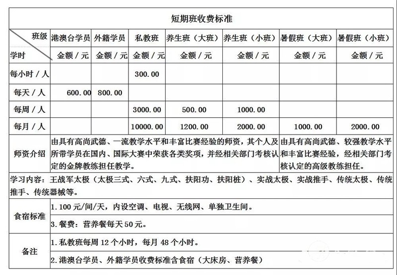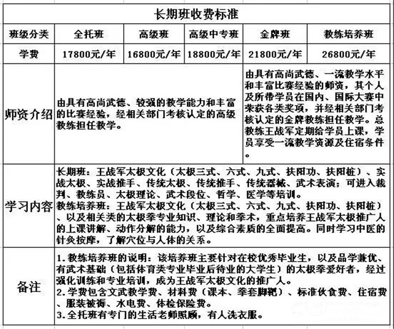 王战军太极学校由太极拳新一代领军人物、征战擂台二十二年未有败绩的王战军先生创办并担任校长和总教练。 自1996年建校以来,培养出了一批批优秀的太极拳人才,他们在推手赛场上势如破竹,斩获冠军无数,可谓:前有常胜将军战无不胜、今有虎狼之师所向披靡! 王战军太极学校是经温县教育局批准成立的,具有中专学历教育资质的特色职业学校。 王战军太极学校2001年被河南省武术运动管理中心评定的温县唯一的河南省“一级”武术学校,被焦作市评为“园林单位”、“民办学校先进单位”。 目前已经和武汉体育大学合作开展联合办学,可以颁发国家承认的大专文凭,以及王战军太极教练员资格证书。 冠军摇篮 学校以太极拳实战及太极文化为核心,以武德、文化和技能教学为重点,旨在培养德才兼备、文武双修的复合型人才。文化教学有小学、初中和中专课程;武术教学设有传统太极、实战太极、自选太极等课程并开设职业教练培养班。 为了培养学生专注、坚强以及自我管理能力、我校实行全日制、半军事化管理,为了开发学生潜能和塑造良好的品格,培养出优秀的人才我校系统地开设了文化、国学、武术等课程,旨在帮助学生通过科学、系统的学习和训练能够健康成长、成为父母的骄傲、社会的栋梁。 舒适温馨的生活环境 2017年,为了让武术有尊严、学生有出路,学校开设了中国职业教练员培养班,旨在通过王战军太极的平台,为学生搭建通向社会的就业平台 学校向社会输送的优秀毕业生(部分) 李天金—杭州太极禅苑总教练、马云贴身保镖 韩飞龙—四川峨眉传奇“太极实战第一人” 杨景媛—王战军太极四川总会主教练 张潮—我校派往尼日利亚授拳教练员 许耀—我校派往马耳他授拳教练员 收费标准 长期班收费标准(全日制) 短期班收费标准 课程设置 王战军太极十六字教学方针: 因材施教 循序渐进 质重于量 悟高于行 全国报名咨询电话: 0391-6418888 0391-6417777 0391-6416666 招生负责人: 王主任 13782830876 QQ: 1317504947 邮编:454865 电子邮箱:1317504947@qq.com 本站责编:张欢 |