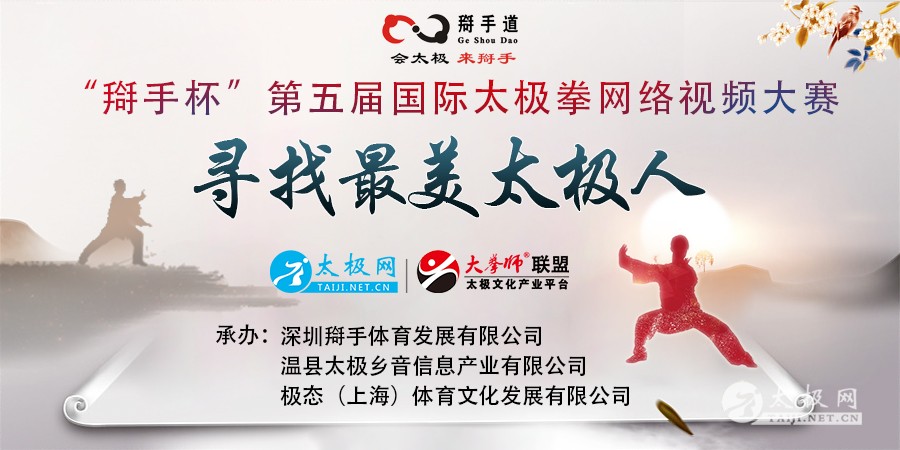寻找最美太极人—— “搿手杯”第五届国际太极拳网络视频大赛通知 国际太极拳网络视频大赛是创立于1997年的太极网(TAIJI.NET.CN)创新打造的太极拳网络在线交流的品牌赛事,前身起源于2005年的“焦作山水杯”国际太极拳DV大赛(太极网主办、焦作市旅游局冠名)。深耕太极文化传播20余载的太极网于2015年创新结合自媒体网络传播风潮举办视频大赛,至今已连续举办四届。 赛事以“寻找最美太极人”为主题,旨在完整记录太极拳传承脉络,保护太极拳传承过程中丰富多彩的形态,展现太极拳传承人英姿。赛事由选手线上报名、线下录制参赛视频、在线展播、在线投票、专家评审、颁奖典礼等环节组成。 “国际太极拳网络视频大赛”被誉为永不落幕的太极拳大赛,自2015年举办首届以来引发全球拳友高度关注。2018年“怀山堂杯”第四届大赛参赛人数三千余人,个人及集体参赛作品共1146个,大赛全体同台展播7天平台访问量近5000万,累计点赞168万,平台留言达3万余条,刷爆广大太极人的朋友圈。 大赛旨在为全球太极拳爱好者打造一个展示太极拳风采、交流太极拳心得、切磋太极拳技艺的开放性网络赛事平台。 第五届国际太极拳网络视频大赛已蓄势待发,恭候全球拳友们上线大展拳脚! 寻找最美太极人——“搿手杯”第五届国际太极拳网络视频大赛具体事项通知如下: 一、活动组织 主办单位: 太极网(TAIJI.NET.CN) 焦作市非物质文化遗产保护中心 少林与太极杂志社 承办单位: 深圳搿手体育发展有限公司 温县太极乡音信息产业有限公司 极态(上海)体育文化发展有限公司 支持单位: 温县文化广电和旅游局 温县太极拳武术文化管理中心 温县非物质文化遗产保护中心 二、活动时间 1. 报名和视频接收:2019年6月1日至7月20日。 2. 大赛全体同台展播及网络投票:8月1日-5日。 3. 专家评审及成绩公布:8月份。 4. 颁奖盛典及其相关主题活动择期举行。