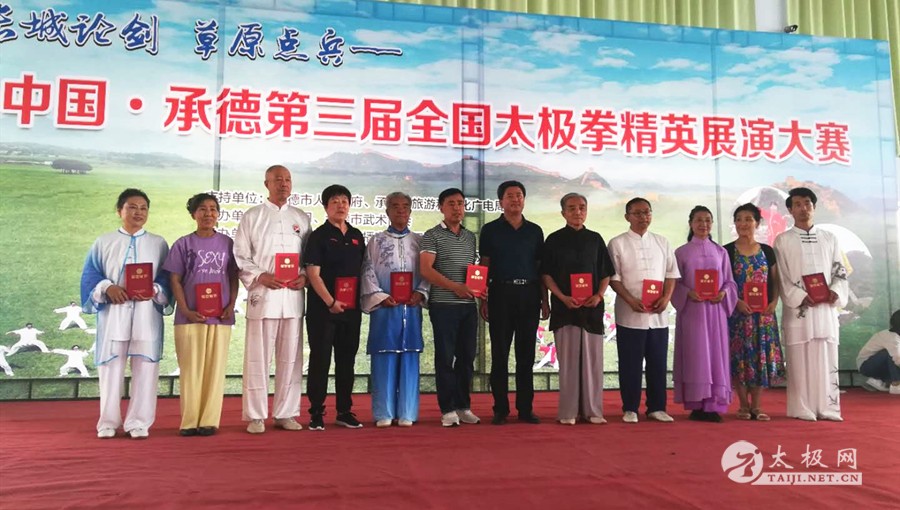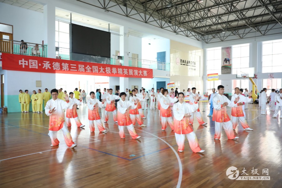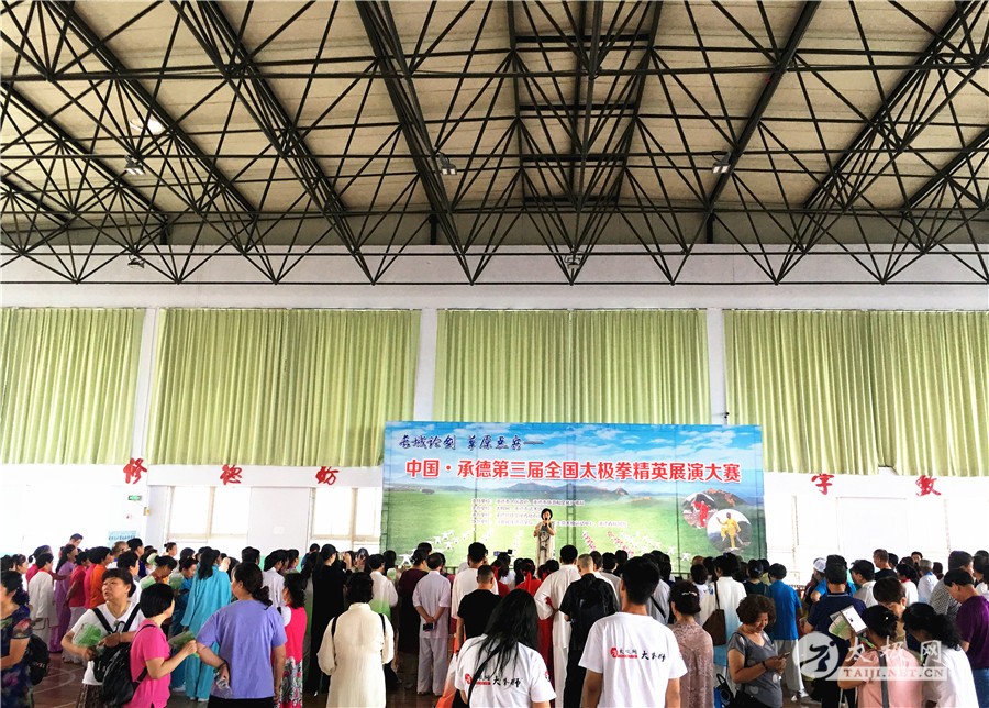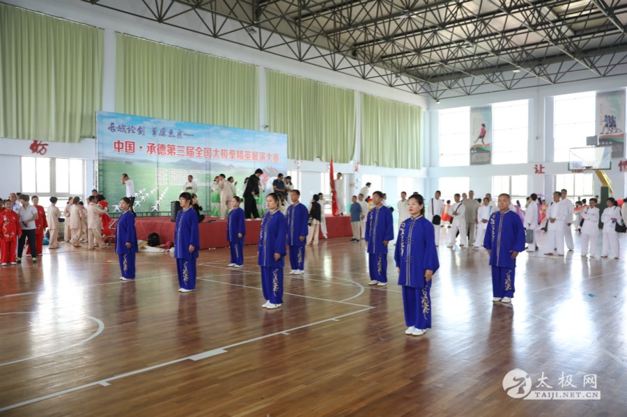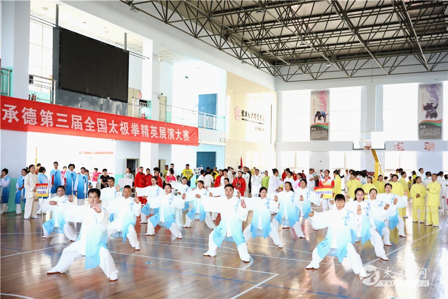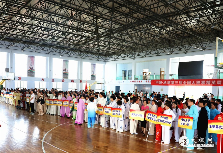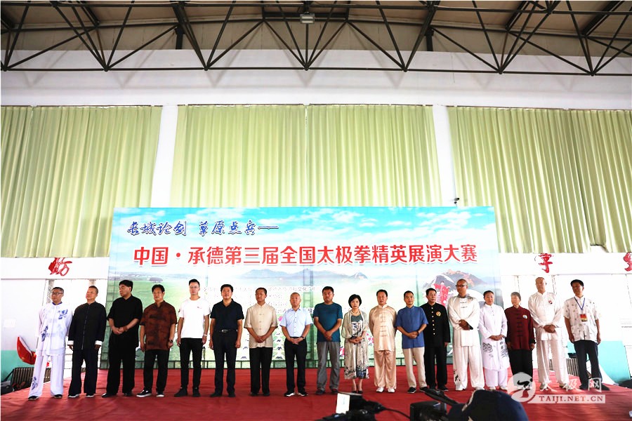 (太极网报道)长城论剑,草原点兵!以太极之名,相约“远方”承德。2019年6月29日,中国承德第三届太极拳精英展演大赛在河北民族师范学院体育馆隆重开幕,来自全国各地40余支代表队600余名拳友相聚承德,共同参加中国·承德第三届太极拳精英展演大赛系列活动,活动由太极网、承德市武术协会主办,承德凯捷文化传播有限公司承办,河北民族师范学院、承德春秋国旅等协办,活动得到了承德市人民政府、承德市旅游和文化广电局的大力支持。 出席开幕式的组委会领导团队有: 大赛组委会主任、太极网创始人刘洪奇 大赛组委会常务副主任、承德市武协主席项争鸣 承德凯捷文化传播有限公司董事长、承德市春秋国际旅行社总经理王臻舟 大赛组委会副主任、太极网总监李超 大赛组委会副主任、河北民族师范学院体育系主任宋广民 大赛总裁判长、承德市武协常务副主席金连起 大赛技术顾问及主要嘉宾有: 太极网名誉总编、原温县太极拳开发委员会主任、原温县体育局长原福全 中国北京九华太极拳馆创始人、石家庄市武式太极拳专业委员会会长张九华 赣州市太极拳协会副会长、中国永萍太极养生俱乐部创始人吴永萍 太极拳名家、温州市太极拳非遗代表性传承人、温州市陈上党太极拳运动中心馆长陈上党