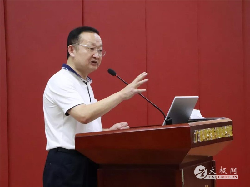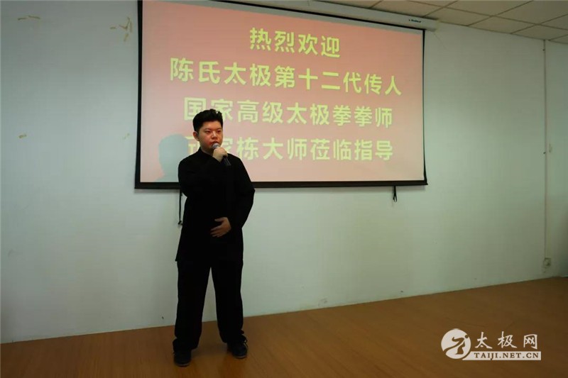 邱家栋先生首先介绍了自己的授业恩师陈小旺先生60年来为太极拳、为弘扬中国传统文化做出的巨大贡献!随后邱家栋老师用平缓的语言、切身的体悟讲述了太极拳的前世今生,从太极拳的起源、何为太极拳、何为太极拳的核心、太极拳的养生之道、太极拳的三大境界和五层功夫以及如何练好太极拳等六个方面,将国粹“太极拳”深入浅出娓娓道来,让现场师生对中国传统非物质文化国粹“太极拳”有了更深刻的认识和了解。