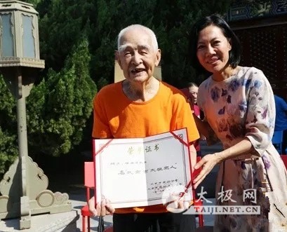| 近日,北京市西城区月坛公园举行慰问百岁太极老人活动,北京市老龄工作委员会办公室常务副主任,北京市老龄协会党委书记、会长王小娥带领老龄委相关部门负责人,北京市武术运动协会会长杜德平,北京武术院副院长、北京市武术运动协会监事长王玲,韩峰、邢强等理事,八卦掌专业委员会副会长李秀仁,北京市西城区体育局副局长陈敬东等相关部门人员参加。 据悉,百岁老人名杨德厚,年轻时跟随陈发科学得陈式太极拳。活动开始,在场人员首先观看了杨德厚老人辅导太极拳,老人虽已百岁,但打起太极来行云流水,仍完整地和学员一起打完了整套拳法。 北京市老龄委党委书记王小娥为杨德厚颁发百岁太极寿星证书 北京市武协会长杜德平在李秀仁女士的陪同下为老人送上题为百岁太极杨厚德载物的字画。 北京武术院副院长王玲在贾悦乾先生陪同下赠送老人一套武悦同人特制太极服装。 杨德厚接受媒体采访介绍说“太极就是借力打力,对方用多大的力气打我,我就用他打我的力气打他。” 太极拳是国家级非物质文化遗产,以中国传统儒、道哲学中的太极、阴阳辩证理念为核心思想,集颐养性情、强身健体、技击对抗等多种功能为一体的中国传统拳术 |