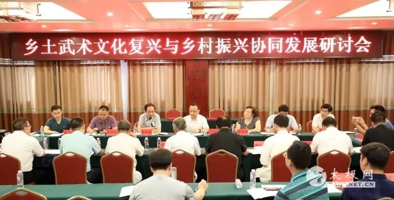 乡土武术文化复兴与乡村振兴协同发展研讨会现场 (来源:温县发布)7月6日上午,乡土武术文化复兴与乡村振兴协同发展研讨会在温县陈家沟召开。郑州大学体育学院党委书记、河南省体育产业研究中心主任张绍通,河南省武术运动管理中心主任马延春,县领导毛文明、王静锋以及相关专家学者和陈式太极拳传承人出席会议。
