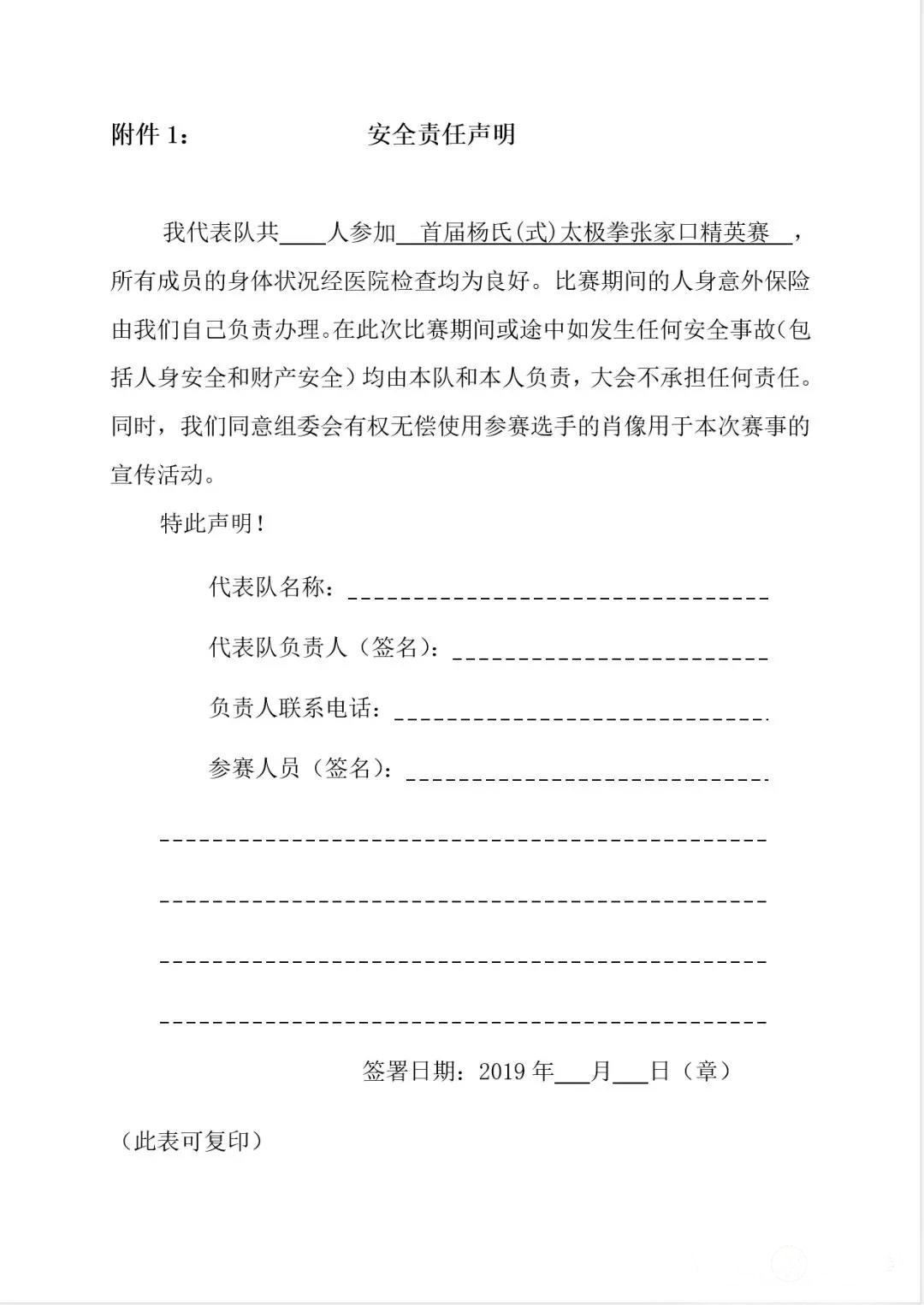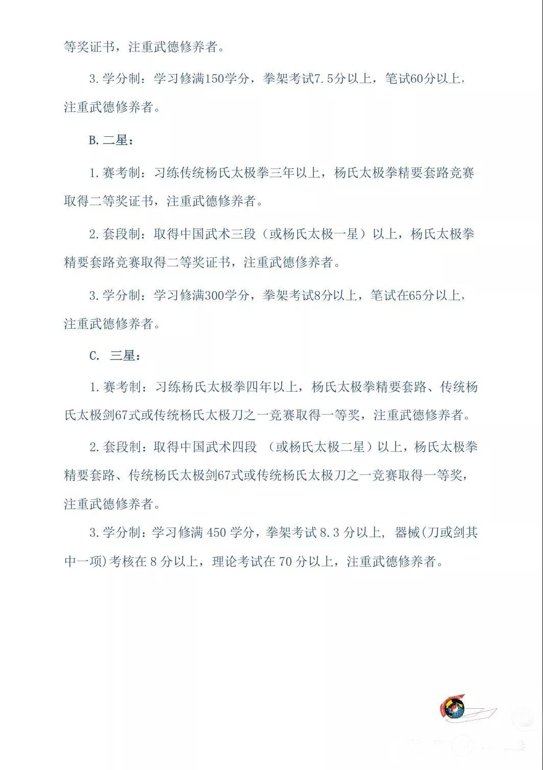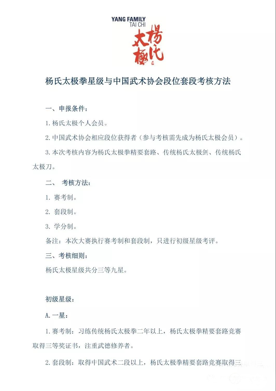 杨氏太极精要套路 关于举办“首届杨氏(式)太极拳张家口精英赛”的通知 各杨氏(式)太极拳组织机构: 为了深入贯彻“健康中国2030”规划纲要,积极推动全民健身活动的具体实施,促进各杨氏(式)太极拳组织机构与习练者之间的相互交流,发挥“杨氏太极”品牌赛事的社会影响力,将“健康中国,太极同行”杨氏太极系列公益活动推向纵深。经研究,决定于2019年9月21日-22日在河北省张家口市举办“首届杨氏(式)太极拳张家口精英赛”,望各相关单位积极组队,届时参赛。 杨氏太极(北京)国际文化发展有限公司 2019年3月26日 首届杨氏(式)太极拳张家口精英赛竞赛规程 一、支持单位 山西省武术协会 张家口市体育局 二、主办单位 杨氏太极(北京)国际文化发展有限公司 三、承办单位 张家口市武术协会 张家口市太极拳协会 山西省武术协会杨氏太极拳研究会 四、协办单位 西安永年杨氏太极拳学会 世界永年太极拳联盟 世界太极拳网 太极网 悦太极 太极疗 云南省武术协会杨式太极拳研究会 五、比赛时间 2019年9月21日-22日 六、比赛地点 张家口市全民健身活动中心 七、参赛单位 各地杨氏(式)太极拳组织 杨氏(式)太极拳习练者 八、竞赛项目 (一)个人项目 1. 杨氏太极拳精要套路; 2. 杨氏(式)太极拳; 3. 国家规定套路:24式简化太极拳; 4. 国家规定套路:40式杨式太极拳; 5. 国家规定套路:太极(八法五步); 6. 传统杨氏(式)太极剑; 7. 传统杨氏(式)太极刀。 (二)集体项目 1. 杨氏太极拳精要套路; 2. 杨氏(式)太极拳(不含八法五步); 3. 传统杨氏(式)太极剑; 4. 传统杨氏(式)太极刀。 九、参加办法 (一) 每支参赛队可报领队1人,教练1-2人,运动员人数不限,男、女不限(支持个人报名)。 (二) 每名运动员可报1—3个单项,可兼报集体项目。 (三) 本次比赛设个人全能奖:每人须参加杨氏(式)太极拳、太极剑、太极刀共三项,按三项得分总和计算成绩(不含24式太极拳和八法五步),按组别分别录取。 (四) 参加杨氏太极技术星级考核者必须是杨氏太极VIP会员,且须参加杨氏太极拳精要套路的比赛。(请在报名表中注明,并填报星级考核申请表,见星级技术考核方法)。 (五) 每队限报集体项目1项,集体项目少于6人时按照规则规定扣分,性别、年龄组别不限。 十、竞赛办法 (一) 比赛采用中国武术协会2012年审定的《传统武术套路竞赛规则》以及有关补充规定执行。 (二) 项目时间 1. 个人项目 ①太极拳:4-5分钟,完成套路时间不超过5分钟,4分钟时裁判长鸣哨提示。 ②太极剑:3-4分钟,完成套路时间不超过4分钟,3分钟时裁判长鸣哨提示。 ③太极刀:50秒-2分钟,完成套路时间不超过2分钟,1分30秒时裁判长鸣哨提示。 2. 集体项目不超过4分钟 集体项目必须配音乐(自备U盘和播放器),音乐中不得出现说唱等内容,若出现说唱裁判长总扣0.1分,未配乐者裁判长总扣0.1分。比赛时,由本队教练或领队负责配合音响师播放音乐。 3. 单项比赛按照各项目运动员的比赛顺序,每2-6名运动员一组,同场比赛,分别评分。 (三) 竞赛年龄分组 1.少、儿组(A、B组):17周岁以下(含17周岁)(2002年1月1日以后出生者)。 2.青年组(C组):18周岁至39周岁(1980年1月1日-2001年12月31日)。 3.中年组(D组):40周岁至59周岁(1960年1月1日-1979年12月31日)。 4.老年组(E组):60周岁至75周岁(含75周岁)(1944年1月1日-1959年12月31日)。 (四)比赛顺序的确定:在仲裁委员会和总裁判长的监督下,由编排记录组运用计算机程序进行分组排序,确定项目比赛顺序和运动员上场顺序,一旦确定,不得更改。 十一、录取名次与奖励办法 (一)集体项目:按杨氏(式)太极拳、杨氏(式)太极剑和杨氏(式)太极刀分别录取,设一等奖20%、二等奖40%、三等奖40%,颁发获奖证书和奖牌(录取比例采取四舍五入的办法)。 (二)个人项目:各单项各组别男、女分别设一等奖20%、二等奖30%、三等奖40%,颁发获奖证书和奖牌,其他10%颁发参赛证书(录取比例采取四舍五入的办法)。 (三)个人全能:各组别男、女分别录取1~3名,颁发获奖证书、奖牌和奖金。 (四)各单项各组别男、女分别报名人数在五人(含五人)以下时,按同类项目不同年龄组别合并,男、女分别在同一组别内编组录取。 (五)本次比赛设 “武德风尚奖”,评选办法另定。 十二、报名与费用 (一)报名方法 1.各参赛队请从http://www.yangtaiji.com.cn/网站、杨氏太极微信公众号giystjq获取报名表和胸牌信息表,不得改变表格格式填写,以附件形式通过电子邮件报名,不符合要求者不予编排。发送邮件时请在“主题”最前头写明单位,以利于查找。 2.报名时间为即日起至2019年7月31日,逾期不予编排。 3.为制作参会人员(包括领队、教练和队医等)胸牌,每人须发送一张红底一寸免冠电子版照片(分辨率300),并注明代表队名称和姓名(与胸牌信息表里的照片一致,方便核对);自行打印纸质报名单和填好的安全责任声明,一并与2019年7月31日以前邮寄到“山西省太原市迎泽大街108号三晋国际酒店D座(南楼)七层”侯英娥收(以当地邮戳为准)。 4. 收件人:侯英娥 邮箱:Reg@yangtaiji.com.cn 电话:0351-7055565 13513646529 18603415785 联系人:杨雅峰 13734000287 (二)费用 1.报名同时交纳费用,收到费用为有效报名。报到时凭报名汇款存根换取收据。 2.会务费:每人100元(包括领队、教练和队医等)。 3.参赛费: ①集体项目:200元/每项。 ②个人每项:100元/每项。 4.星级考核费:每人200元 5.其它费用自理。组委会