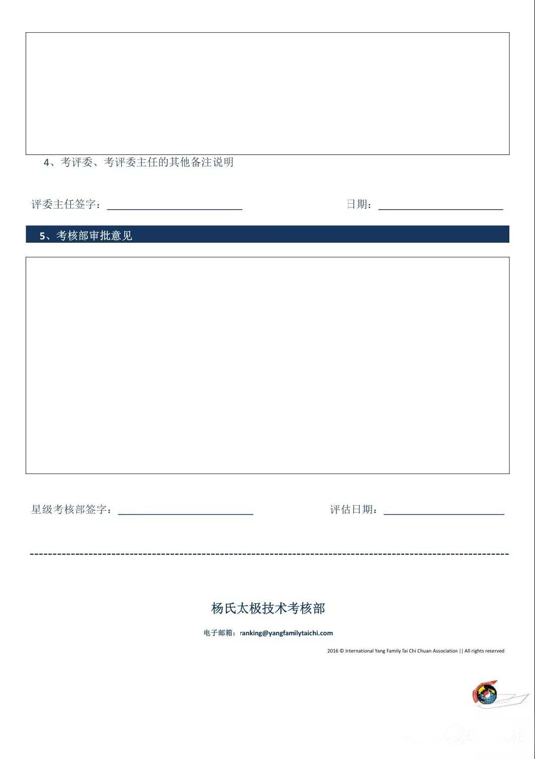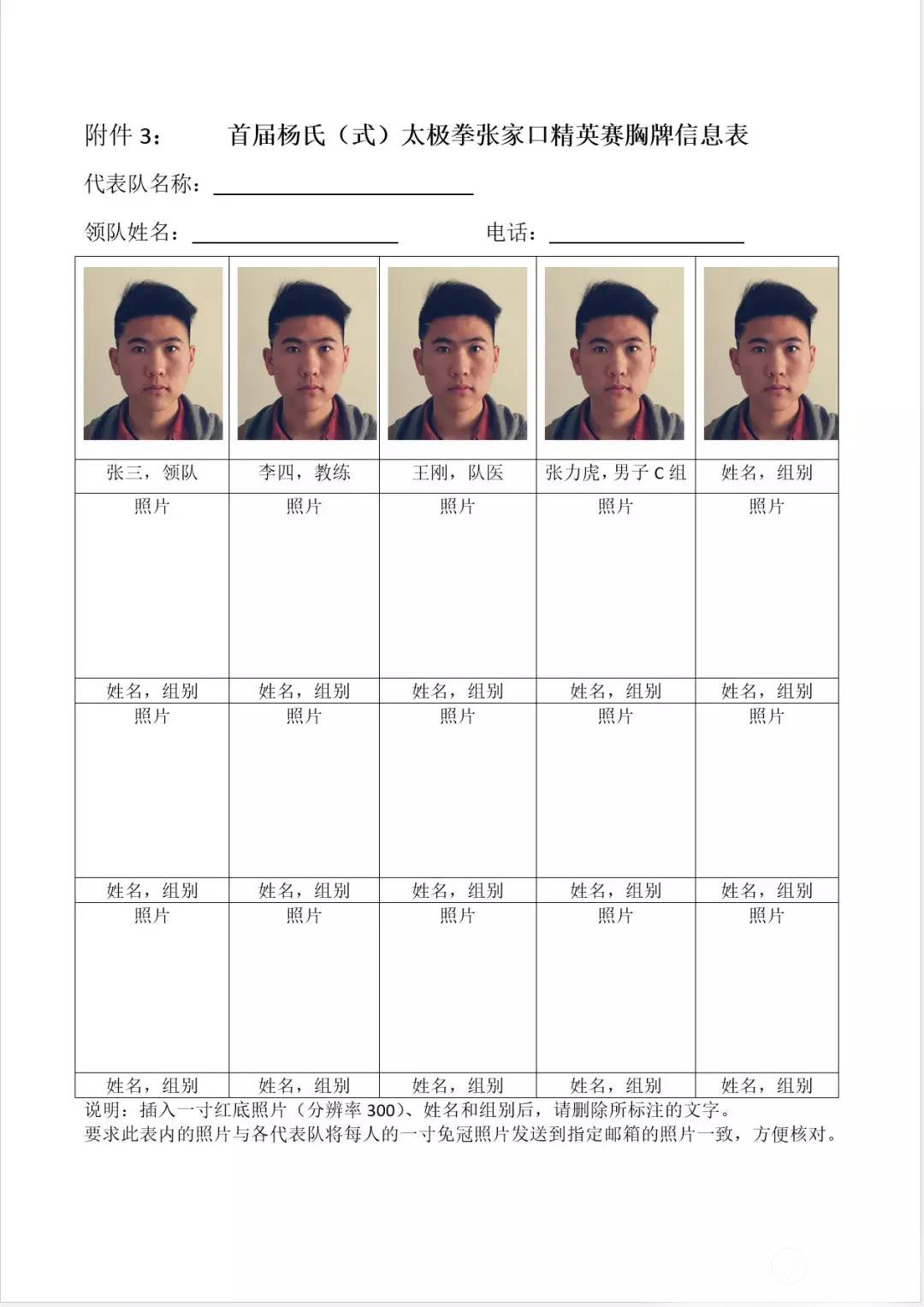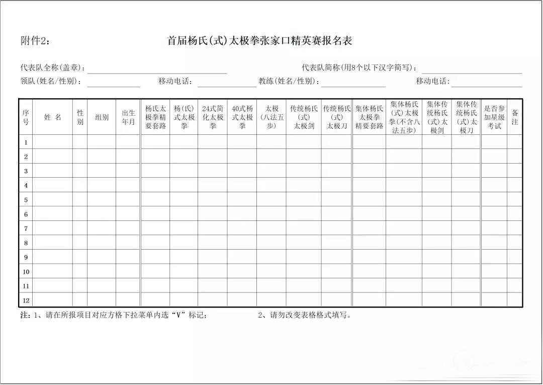 杨氏太极精要套路 关于举办“首届杨氏(式)太极拳张家口精英赛”的通知 各杨氏(式)太极拳组织机构: 为了深入贯彻“健康中国2030”规划纲要,积极推动全民健身活动的具体实施,促进各杨氏(式)太极拳组织机构与习练者之间的相互交流,发挥“杨氏太极”品牌赛事的社会影响力,将“健康中国,太极同行”杨氏太极系列公益活动推向纵深。经研究,决定于2019年9月21日-22日在河北省张家口市举办“首届杨氏(式)太极拳张家口精英赛”,望各相关单位积极组队,届时参赛。 杨氏太极(北京)国际文化发展有限公司 2019年3月26日 首届杨氏(式)太极拳张家口精英赛竞赛规程 一、支持单位 山西省武术协会 张家口市体育局 二、主办单位 杨氏太极(北京)国际文化发展有限公司 三、承办单位 张家口市武术协会 张家口市太极拳协会 山西省武术协会杨氏太极拳研究会 四、协办单位 西安永年杨氏太极拳学会 世界永年太极拳联盟 世界太极拳网 太极网 悦太极 太极疗 云南省武术协会杨式太极拳研究会 五、比赛时间 2019年9月21日-22日 六、比赛地点 张家口市全民健身活动中心 七、参赛单位 各地杨氏(式)太极拳组织 杨氏(式)太极拳习练者 八、竞赛项目 (一)个人项目 1. 杨氏太极拳精要套路; 2. 杨氏(式)太极拳; 3. 国家规定套路:24式简化太极拳; 4. 国家规定套路:40式杨式太极拳; 5. 国家规定套路:太极(八法五步); 6. 传统杨氏(式)太极剑; 7. 传统杨氏(式)太极刀。 (二)集体项目 1. 杨氏太极拳精要套路; 2. 杨氏(式)太极拳(不含八法五步); 3. 传统杨氏(式)太极剑; 4. 传统杨氏(式)太极刀。 九、参加办法 (一) 每支参赛队可报领队1人,教练1-2人,运动员人数不限,男、女不限(支持个人报名)。 (二) 每名运动员可报1—3个单项,可兼报集体项目。 (三) 本次比赛设个人全能奖:每人须参加杨氏(式)太极拳、太极剑、太极刀共三项,按三项得分总和计算成绩(不含24式太极拳和八法五步),按组别分别录取。 (四) 参加杨氏太极技术星级考核者必须是杨氏太极VIP会员,且须参加杨氏太极拳精要套路的比赛。(请在报名表中注明,并填报星级考核申请表,见星级技术考核方法)。 (五) 每队限报集体项目1项,集体项目少于6人时按照规则规定扣分,性别、年龄组别不限。 十、竞赛办法 (一) 比赛采用中国武术协会2012年审定的《传统武术套路竞赛规则》以及有关补充规定执行。 (二) 项目时间 1. 个人项目 ①太极拳:4-5分钟,完成套路时间不超过5分钟,4分钟时裁判长鸣哨提示。 ②太极剑:3-4分钟,完成套路时间不超过4分钟,3分钟时裁判长鸣哨提示。 ③太极刀:50秒-2分钟,完成套路时间不超过2分钟,1分30秒时裁判长鸣哨提示。 2. 集体项目不超过4分钟 集体项目必须配音乐(自备U盘和播放器),音乐中不得出现说唱等内容,若出现说唱裁判长总扣0.1分,未配乐者裁判长总扣0.1分。比赛时,由本队教练或领队负责配合音响师播放音乐。 3. 单项比赛按照各项目运动员的比赛顺序,每2-6名运动员一组,同场比赛,分别评分。 (三) 竞赛年龄分组 1.少、儿组(A、B组):17周岁以下(含17周岁)(2002年1月1日以后出生者)。 2.青年组(C组):18周岁至39周岁(1980年1月1日-2001年12月31日)。 3.中年组(D组):40周岁至59周岁(1960年1月1日-1979年12月31日)。 4.老年组(E组):60周岁至75周岁(含75周岁)(1944年1月1日-1959年12月31日)。 (四)比赛顺序的确定:在仲裁委员会和总裁判长的监督下,由编排记录组运用计算机程序进行分组排序,确定项目比赛顺序和运动员上场顺序,一旦确定,不得更改。 十一、录取名次与奖励办法 (一)集体项目:按杨氏(式)太极拳、杨氏(式)太极剑和杨氏(式)太极刀分别录取,设一等奖20%、二等奖40%、三等奖40%,颁发获奖证书和奖牌(录取比例采取四舍五入的办法)。 (二)个人项目:各单项各组别男、女分别设一等奖20%、二等奖30%、三等奖40%,颁发获奖证书和奖牌,其他10%颁发参赛证书(录取比例采取四舍五入的办法)。 (三)个人全能:各组别男、女分别录取1~3名,颁发获奖证书、奖牌和奖金。 (四)各单项各组别男、女分别报名人数在五人(含五人)以下时,按同类项目不同年龄组别合并,男、女分别在同一组别内编组录取。 (五)本次比赛设 “武德风尚奖”,评选办法另定。 十二、报名与费用 (一)报名方法 1.各参赛队请从http://www.yangtaiji.com.cn/网站、杨氏太极微信公众号giystjq获取报名表和胸牌信息表,不得改变表格格式填写,以附件形式通过电子邮件报名,不符合要求者不予编排。发送邮件时请在“主题”最前头写明单位,以利于查找。 2.报名时间为即日起至2019年7月31日,逾期不予编排。 3.为制作参会人员(包括领队、教练和队医等)胸牌,每人须发送一张红底一寸免冠电子版照片(分辨率300),并注明代表队名称和姓名(与胸牌信息表里的照片一致,方便核对);自行打印纸质报名单和填好的安全责任声明,一并与2019年7月31日以前邮寄到“山西省太原市迎泽大街108号三晋国际酒店D座(南楼)七层”侯英娥收(以当地邮戳为准)。 4. 收件人:侯英娥 邮箱:Reg@yangtaiji.com.cn 电话:0351-7055565 13513646529 18603415785 联系人:杨雅峰 13734000287 (二)费用 1.报名同时交纳费用,收到费用为有效报名。报到时凭报名汇款存根换取收据。 2.会务费:每人100元(包括领队、教练和队医等)。 3.参赛费: ①集体项目:200元/每项。 ②个人每项:100元/每项。 4.星级考核费:每人200元 5.其它费用自理。组委会