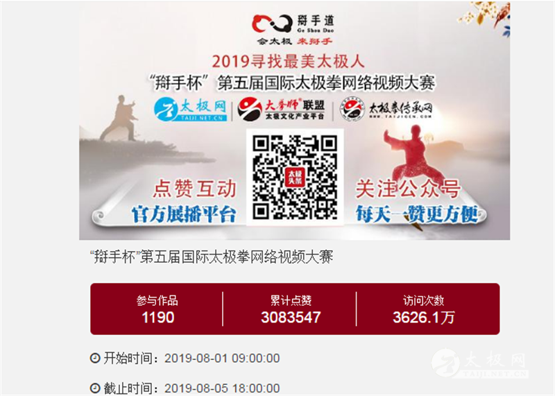 (太极网报道)健康中国,太极同行!太极,以网会友!寻找最美、展示最美、传播最美、点赞最美!8月5日下午,一年一度的“互联网+太极拳”年度盛会、万众瞩目的2019寻找最美太极人——“搿手杯”第五届国际太极拳网络视频大赛网络展播活动经过5天持续高能燃烧圆满收官。 大赛全体同台展播点赞从8月1日9:00开始,截至5日18:00收官,平台累计网络访问量3600余万次,投票点赞高达300余万次,广大拳友们互动留言频繁刷屏,高达4万余条,连续5天燃爆太极人的朋友圈!互联网赋能“太极拳”的盛会充分彰显了太极拳的无穷魅力。 深耕太极文化传播20余载的太极网于2015年创新结合新时代网络媒体生态举办视频大赛,至今已连续举办四届,引发全球拳友高度关注,影响力、权威性逐年增强。本届赛事口号“会太极·来搿手”,本届大赛规模再创新高,各地拳友和太极拳组织共2000人参赛、1190部参赛作品(含69个集体项目),千万拳友踊跃互动交流,盛况空前,好评如潮。 本着"公开透明、客观全面、权威公正"的评审原则,在大赛展播点赞的网络基础上,组委会将遴选太极拳界名师名家组成强大的评审阵容为大赛评审工作提供坚实保障,让大赛不仅仅具有观赏性更加具有权威性,为展示太极时代篇章、推动太极拳国际化发展积极贡献。 大赛评审结束后统一公示成绩,届时大赛组委会还将发布本届大赛颁奖典礼等线下主题活动通知,期待拳友们以网会友、以武会友,交流、交心、交朋友,让“永不落幕的太极拳大赛”伴随广大太极人在太极大道上同行。 大赛组委会 |