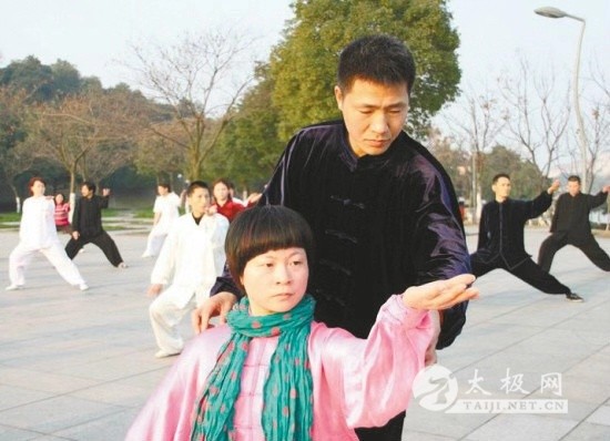 义乌素有“武术之乡”的美称,幼时好动的我,耳闻目染,潜移默化地喜欢上了舞枪弄棒,劈腿下腰,对习武心仪不已,鉴于当时条件有限,美好的愿望只能深深地埋藏在心底。工作生活稳定了以后,对武术的憧憬又开始在心湖里泛起涟漪,尤其是中华武术的瑰宝——太极拳,在我的脑海里更像是蒙着一层神秘的面纱,太极圣地陈家沟也让我魂牵梦萦,神驰心仪……而帮我撩起这层神秘面纱让我真正进入太极拳殿堂的应该是我的师傅王国营老师。2009年,我慕名来到了王国营老师创办的义乌陈氏太极拳培训中心开始学习陈氏太极拳。 王国营指导教学 首先是学习陈氏老架75式套路,说实在的,刚刚学习接触太极拳,我仅能勉强记住老师教的招式,而对于老师讲的太极拳诸多拳理、拳法,我真是云里雾里,晕头转向,不知所云。经过3,4个月熟悉套路招式,自已能依样画葫芦把一套拳完整打下来了。老师紧接着开始整架,即“正架子”。而我也是从那时候才开始正式慢慢理解太极拳的要理与精髓。太极拳要求刚中带柔,柔中藏刚,刚柔相济,而那时候的我也犯初学者有刚无柔的通病,身体与四肢非常僵直,老师就反反复复强调周身放松,细心指导从关节肌肉的放松,到虚领顶劲,沉肩坠肘,松胯垂臀等等,耐心讲解说明只有松下来,松开,松透,才能以意导气,以气领劲,内劲才能出来。有松才会柔。松柔贯穿于整个拳架中才是太极拳独具的特色和风格。太极拳中双腿常需屈膝下蹲,我常犯的二个毛病就是屈膝过甚,膝盖超过脚尖或者裆低于膝。老师提醒了我很多次,我也尽量按老师的要求去做,但稍不注意,就老毛病复发,翻来覆去有时自已觉得很沮丧,却又不得其解,直到有一天老师的一席话让我茅塞顿开,豁然开朗。因为自已学拳时间不长,下肢功力不足,而这时如果架子下的低,腿部承受不起整个身体的重量,就容易出现这些个问题,所以先要加强基本功的锻炼,循序渐进,急躁不得。从这点点滴滴的事例里,我深刻的体会到,太极拳包含着博大精深的道理与内涵,只有明师的指点与自已循规蹈矩按太极阴阳规范练功,经过千锤百炼,才能脱胎换骨啊。但王老师有时也会故意整我一下,为了让我感悟自已犯得毛病,加深理解与记忆。记得正架到单鞭招式的时候,老师出其不意,轻轻地从后面勾了我的踝关节一下,我立马重心不稳,顺势倒地,正在我丈二金刚摸不着头脑之际,老师问我,“站桩的要求怎么样的?想想。”我面红耳赤耳,同时豁然开朗,只有做到松腰坐胯,气沉丹田,脚趾抓地才能使下盘稳于泰山啊。经过一个月的正架子,我觉得自已学到了很多拳理要求,套路打得明显规整很多,学会了用理论去检验自已的拳架。