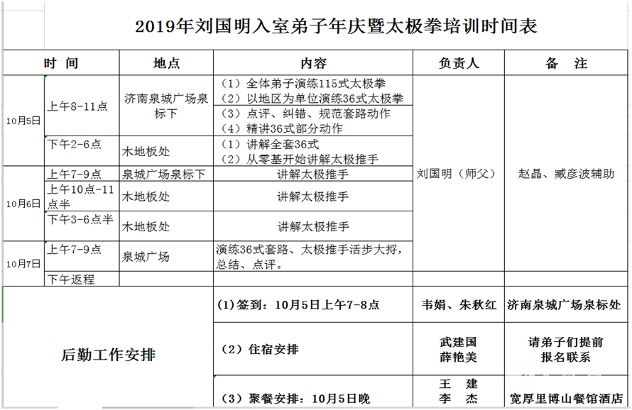 经《刘国明太极拳理事会》决定,于2019年10月5日至7日,在山东济南泉城广场举办“2019年刘国明太极拳套路、太极推手培训暨入室弟子年庆”,欢迎大家报名参加。 一、培训内容: 1、展演、点评115式、36式太极拳。 2、精讲36式太极拳。 3、讲解、示范太极推手(单、双、四正)。 二、报名参加人员条件: 刘国明老师入室弟子、预备弟子、太极拳空中大课堂学生、太极网学生。 三、报名事项: 1、空中太极拳大课堂各群的同学、“太极网”群听课的同学,均可在本群副群主处报名,入室弟子在弟子群报名。 2、需要统一安排住宿的学员,报名时提前说明。 3、参训人员请自带太极服装、太极鞋,要求形象端庄大气(因在泉城广场)。 四、培训费用: 1、正式入室弟子免费参加各项培训,其他所有参加培训人员,每人缴纳培训费300元。 2、10月5日晚六点全体参训人员聚餐,(标准餐),每人80元。 3、入室弟子报名时,每人交80元。非正式入室弟子报名时,每人共交380元。 4、所交费用一律用微信转给培训群群主朱秋红。 五:其他事项: 1、报名截止日期:10月5日 2、建立:“2019培训群”,凡是报名的同学,即可加入此群。群内提前开课:(1)培训注意事项。(2)学习36式太极拳、太极推手教学视频,(3)师生互动,解疑答难,力求每位参训同学收获满满。 3、因特殊情况,可在10月5号现场报名。 3、联系电话: 15966319866 薛艳美 15550070165 朱秋红 4、如有未尽事宜,待后补充。 刘国明太极拳理事会 2019年9月11日 附:培训内容、时间表: |