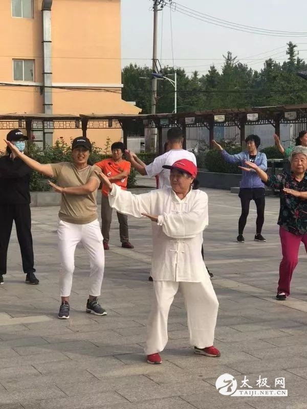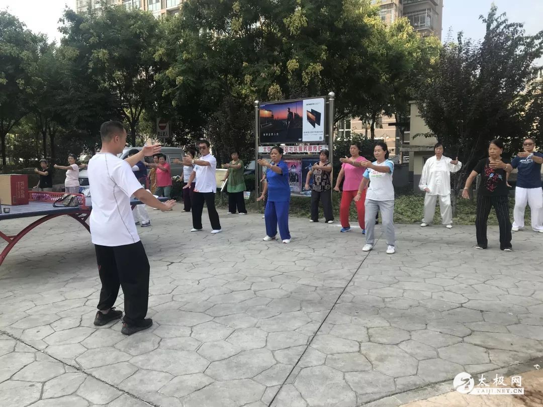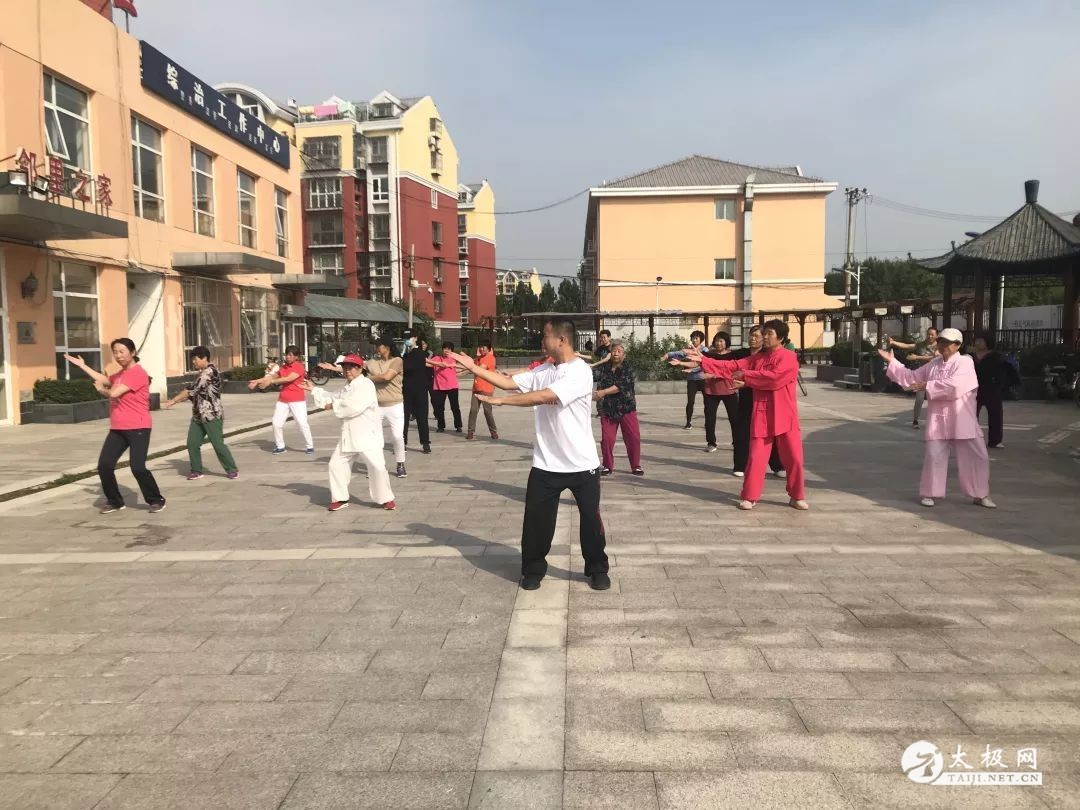 太极培训第一天就有好多社区居民报名参与。随着太极八法五步张宇教练的一声练习口令,大家都按照老师的动作开始学习太极拳。