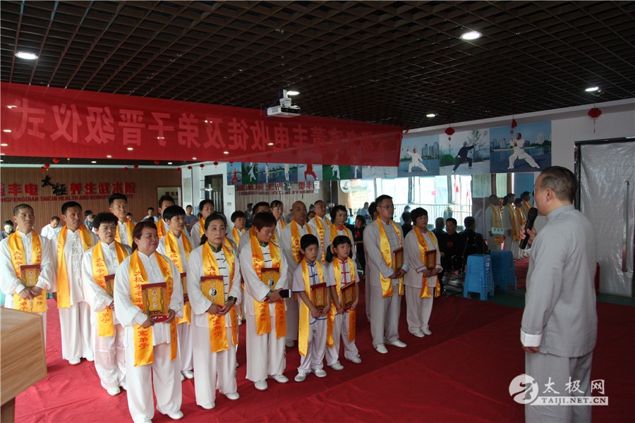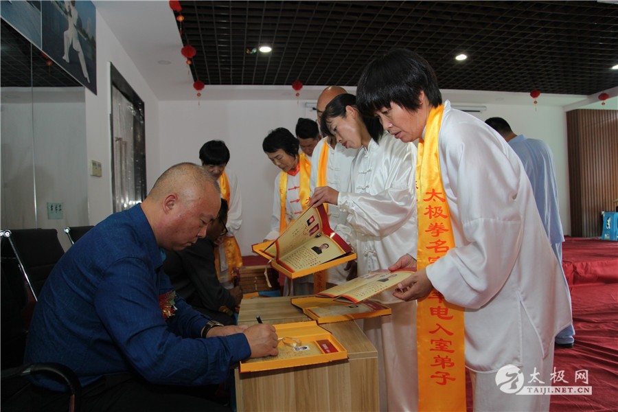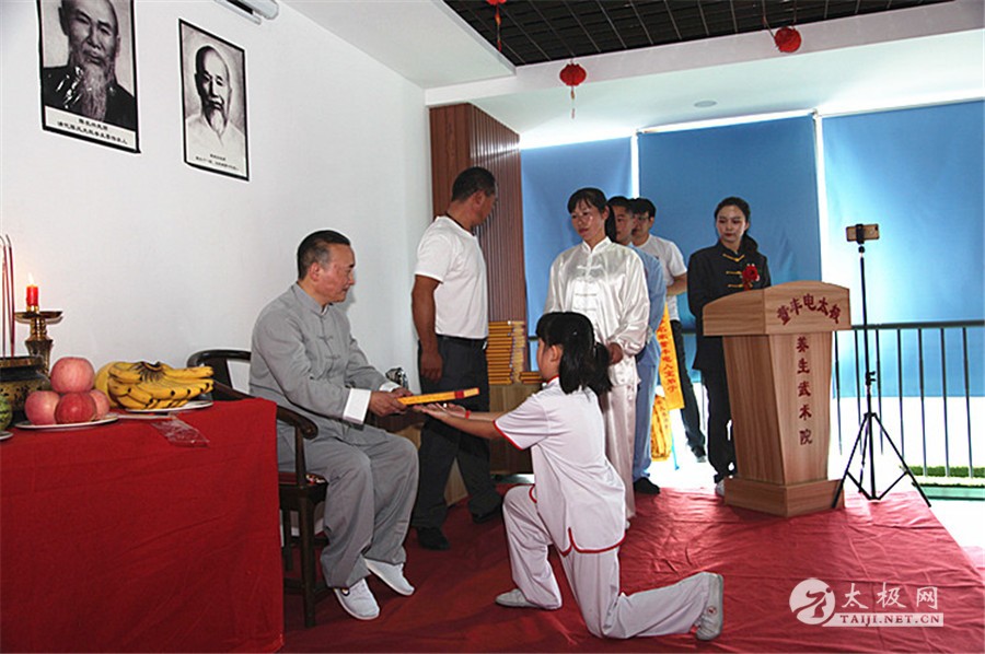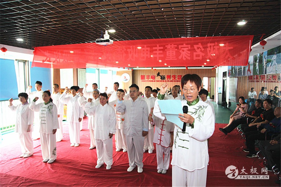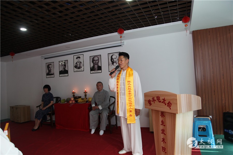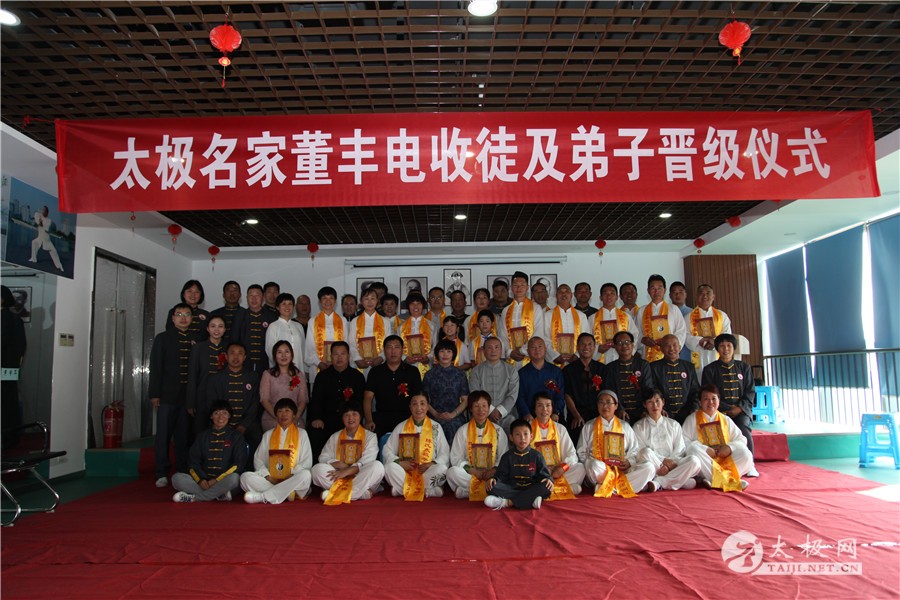 (太极网讯)2019年10月1日,举国同庆,良辰佳节,太极薪火传承同样迎来一场喜事,太极拳名家董丰电收徒及弟子晋级仪式于郑州市大学南路绿地滨湖国际城举行,又一批学员及太极拳爱好者即将成为太极拳传承人,为太极拳的传承和传播增添新生力量。 董丰电及其夫人 与会嘉宾 温县太极拳武术运动管理中心副主任范小涛、太极网创始人刘洪奇、董丰电太极养生武术院弟子理事会代表陈永恒、长葛市太极拳协会会长黄学军、河南省日化协会主席郑红民、河南省手工业品产业协会会长陈振强以及董丰电部分弟子应邀出席并见证仪式,仪式由董丰电入室弟子董宁迪主持。 范小涛讲话 刘洪奇讲话 董宁迪主持 本次晋级入室弟子的人员有:刘一鸣、刘馨媛、李向科、周云、高爱玲、崔瑞玲、李凤梅、史晓雪、贾铁山、赵改勤、花中新、师润红、孟英琴等人,拜师入门的人员有:步辉、许美英、张书兰、赵丽艳、李保顺、卜建刚、李桂枝、陈云修、黄春等人。 陈永恒致辞 收徒仪式遵循传统礼仪,简洁庄重,见证嘉宾、董丰电太极养生武术院弟子理事会代表陈永恒致辞,以告太极薪火衣钵相传,并宣读拜师人员及晋级入室弟子人员名单。 董丰电携晋级弟子代表高爱玲、准弟子代表黄春带领大家向太极拳始祖陈王廷及历代先师跪拜并礼敬上香,高爱玲带领众弟子宣誓。 董丰电上香祭祖 高爱玲带领众弟子宣誓 拜师仪式 拜师仪式上弟子们依次向师父、师母行叩拜礼并敬茶,仪式庄严有序进行。 在见证嘉宾刘洪奇及陈永恒等众人见证下,拜师仪式圆满礼成。 见证人刘洪奇签字 董丰电向弟子们训话表示,希望有缘拜师的入门弟子,恪守门规,克己正身,敬业修德,传承师艺,以传播传统文化为己任,积极做太极拳文化的传播者、传承者,大家携手共同为太极拳发扬光大贡献力量。 新弟子代表黄春表态发言,一定谨记师父教诲,不负使命,担当起传播弘扬太极拳的重任。见证嘉宾黄学军、范小涛和刘洪奇等分别讲话并向董丰电老师和弟子们表示祝贺,希望新弟子们能够严于律己,早日成为优秀的太极拳传人,肩负起传承和传播太极拳的使命。 黄学军 黄春 中华武术,源远流长,博大精深,千百年来,师徒相授一直是武术最主要的传承形式,因此,武术界,尤其是传统武术界,特别强调师徒名分,讲究尊师礼节,注重拜师礼仪。今天的收徒拜师仪式,对董丰电太极团队来说,具有非凡的意义。它标志着中华优秀传统文化在此传承,标志着又有一批优秀的太极人将肩负起对中华传统文化传播与发展的重任。希望所有弟子们不负师父的厚望,能够做到理精法明,德艺双修,将来真正成为优秀的太极拳传人。