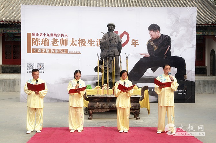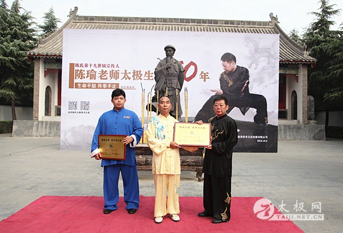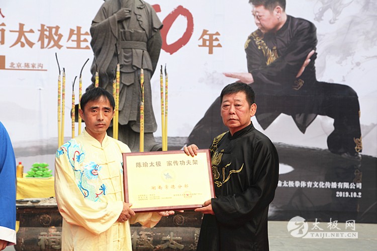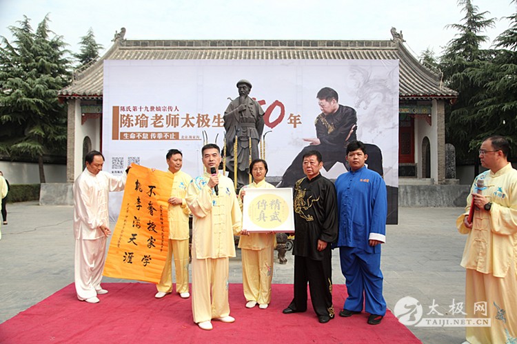 (太极网讯)根源圣地陈家沟,正脉承传秉父志。太极生涯五十载,家传功夫扬天下!10月2日,一代宗师陈照奎独子、陈家沟陈氏第十九世嫡宗传人陈瑜祭祖收徒及太极生涯五十周年纪念活动在陈家沟祖祠隆重举行,来自海内外的百余名陈瑜弟子传人共襄盛会,点燃太极圣地的璀璨星光。 陈家沟陈氏第十九世嫡宗传人陈小旺及夫人孙冬侠,陈家沟陈氏第十九世嫡宗传人陈小星,陈家沟陈氏第二十世嫡宗传人陈自强、陈世武,陈家沟村委会主任陈景元,陈家沟陈氏家族族长陈景安、理事会会长陈一华、理事会秘长陈石岩等嘉宾出席见证。 寻根祭祖,追思缅怀,感念先人传拳之丰功伟绩,陈石岩主持祭祖仪式。陈小旺、陈小星、陈瑜三兄弟率众弟子向陈家沟陈氏先祖及太极拳创始人陈王廷和历代太极拳先师上香行礼,秉承不忘先祖教化的传承之道,表达对先祖的深深敬仰与浓浓怀思之情。 陈小旺上香祭祖 陈瑜师父与张思雨师母 弟子递交拜师贴 陈瑜向弟子训话 收徒仪式彰显着太极拳的传承与蓬勃发展,意义重大而深远。李富喜、高建军、刘煜、万盛平、张涛、吴道伟、冯岳山、谢小丽、甘颂民、弗拉德、徐仁全、杨克江和薛建涛等13位新入门弟子依次向师父递交拜师帖、行拜师礼。陈瑜向各位弟子训话表示,入门之后,要认真、谦虚地习练太极拳,继承、传播好太极拳,让“家传功夫”造福人类。 老弟子刘磊宣读门规 新弟子代表冯岳山发言 新入门弟子杨克江宣读拜师贴 老弟子代表刘磊师兄宣读陈瑜弟子门规。新入门弟子冯岳山代表发言表示,拜入陈瑜老师门下满怀感恩,今后会恪守门规祖训,谨遵师父教诲,团结同门兄弟,努力学习拳理拳法,为太极拳的传承与发展贡献自己的力量。 在欢乐喜庆的氛围中,陈瑜老师太极生涯五十周年纪念活动开启,陈瑜弟子牟金海和王素芳担任主持。“半世纪,白驹过隙,五十载,天下桃李,抬望眼,师徒共谱新曲”。为庆祝陈瑜老师太极生涯五十周年纪念活动,在师母思雨老师的指导下,弟子黄炜和陈超对2006年建立的陈瑜太极网站进行了改版升级工作,举办的“和陈瑜学拳的日子——桃李不言下自成蹊”文章征集活动也得到的弟子们的积极响应和参与。 纪念活动收到了来自世界各地陈氏太极家传功夫架爱好者的祝福视频,活动现场两位弟子代表为师父献上墨宝以表敬意和感恩之情,随后陈瑜之子陈世武与师兄弟们献上了精彩的太极拳展演和文艺活动,将现场欢快的氛围不断推向高潮。 陈瑜太极家传功夫架分部授牌仪式 陈瑜携众弟子于太极拳宗师祖林祭拜 合影留念 陈瑜,生于1962年,祖籍河南温县陈家沟,现居北京,是陈家沟陈氏第十七世宗师陈发科之嫡孙、陈氏第十八世宗师陈照奎之独子。为弘扬传播陈氏太极拳跑遍祖国大江南北,职业拳师。现任中国北京市武术运动协会陈式太极拳研究会委员、北京市武术运动协会陈照奎太极拳社社长、陈家沟太极拳协会终身顾问、陈家沟太极拳学校副校长。 陈瑜自幼在一代宗师陈照奎的严格要求下潜心习艺,日练拳20遍以上,他刻苦练功,将拳法与技击相互贯通。尤其是父亲去世后,他逐渐意识到自己肩上担子的沉重,闭门苦练,功夫已臻上乘。如今他的功夫炉火纯青,在继承、发扬及推广陈氏太极拳上做出了卓越的贡献。 本站编辑:太极网安安 |