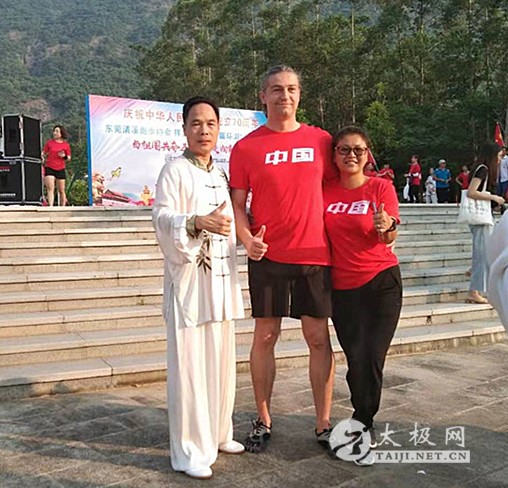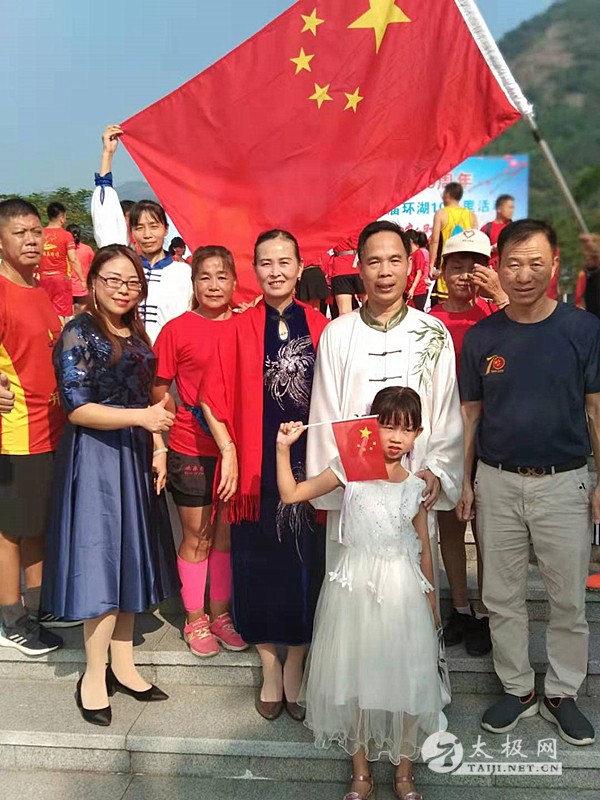 为庆祝中华人民共和国成立70周年,10月1日,东莞市清溪跑步协会联合祥文公司组织开展主题为“与祖国共奋进,健步走向新时代”的第七届环湖10公里活动。本次活动吸引了近800人参加,路线为从沿祥文公司出发,途经清溪湖环湖绿道、银瓶山游客服务中心,其中银瓶山服务中心为休息补给站。活动现场人们挥舞着手中的五星红旗,带着热情洋溢的微笑前进。 东莞武术协会清溪博圆太极馆的学员在领队、教练黄裔生的带领下参加了本次活动,展演了集体24式简化太极拳、集体武当太极剑、 集体太极功夫扇、陈式太极拳73式、56式、63式武当太极剑等套路,展示了协会队员的风采,展现了太极拳的神韵与魅力,得到了现场观众的赞赏与认可。 黄裔生(白衣) 黄裔生拳照 黄裔生