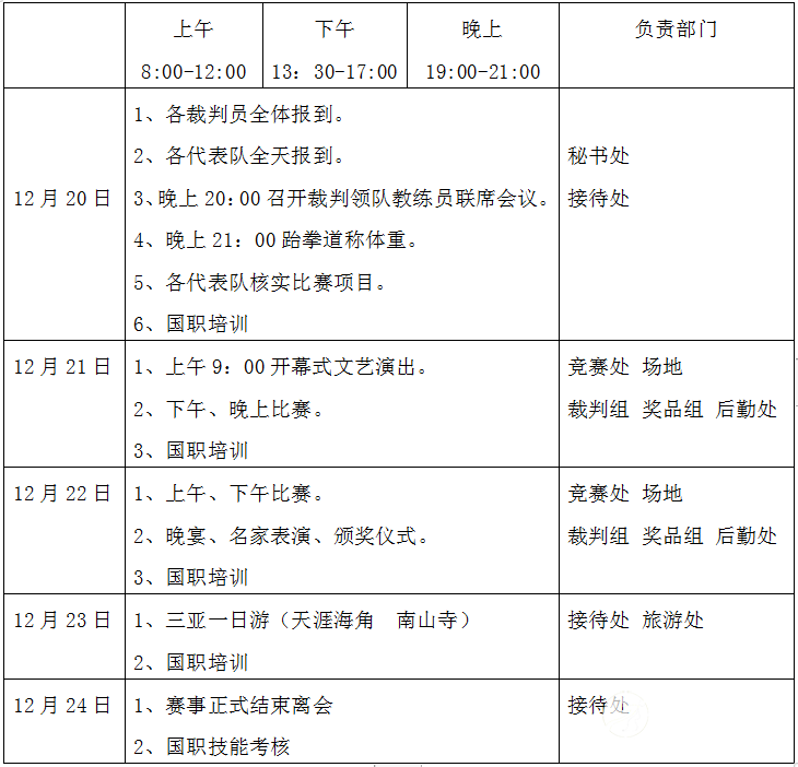 2019第四届三亚国际旅游武术文化节竞赛规程 一、活动组织 指导单位:三亚市旅游和文化广电体育局、海南省武术协会 主办单位:国际格斗协会、太极网、少林功夫国际文化协会 承办单位:三亚市武术协会 协办单位:海南省三亚技师学院 三亚市国际文化交流中心 三亚鲁艺文化体育发展有限公司 尚武国术(海南)文化传媒有限公司 三亚市天涯区武术文化培训中心 海南武韵功夫文化传媒有限公司 三亚天天跆拳道馆 海南三亚陈家沟陈炳太极院 三亚市太极健身研究会 三亚市散打搏击运动协会 乐东跆拳道协会 三亚市搏击协会 三亚市孔子学会 三亚市体育旅游协会 三亚前程旅游公司 三亚市摔跤协会 海南严氏武道 支持单位: 三亚爱新觉罗皇家生活馆 海南字在文化科技有限公司 二、竞赛时间、地点 时间:2019年12月20—24日 地点:三亚市体育中心 开幕式:2019年12月21日上午9点 报名截止:12月10日 三、参赛单位 国内外武术爱好者个人、社会团体、业余体校、武术馆校、高校等均可报名参赛。 四、竞赛类型 分个人赛和集体赛,详见竞赛规程。 五、媒体支持及宣传 三亚日报、海南日报、三亚电视台、海南电视台、快手直播、抖音视频及各大直播平台,东方卫视、广东体育台、凤凰卫视、中国体育报、中国教育报、太极网、大拳师联盟网、太极拳传承网、太极拳APP、太极国际旅游网、全球功夫网、全球创业网、全球功夫杂志、美国功夫杂志、新浪网、搜狐网、优酷网、雅虎网、中华武术杂志、少林与太极杂志、武魂武道杂志、武当杂志、拳击与格斗杂志、天涯社区以及各省市电视台、报纸等媒体将全程追踪报道本次盛会。三亚全球电视台全程直播开幕式与比赛盛况。 三亚起武,展现天人合一的壮美画面!组委会将征集广大武术人在三亚美景天涯海角中的武术风采展示,精美图片与视频将借助广大官方媒体和自媒体发布宣传。 寻找“三亚国际武术形象大使”:太极网将搭建网络展播平台,参赛选手皆可将三亚参赛期间所拍摄的武术照片和短视频发送至组委会,通过展播和点赞引爆广大武术人的朋友圈,根据最终展播投票结合组委会专家评审,评选和表彰一批“三亚国际武术形象大使”,颁发荣誉证书和奖杯。 六、大会主题活动 1. 三亚国际武术文化节比赛。 2. 三亚国际武术文化旅游高峰论坛。 3. 世界武术冠军精英及武术名家展演、功夫明星见面会,组团达30人及以上可推荐一人参加名家展演。 4. 颁奖盛典:除大赛奖项及优秀教练员评选表彰之外,为表彰和宣传支持大赛及三亚旅游的武术个人和团队,组委会将对此次活动的“武术名家”“先进单位”等进行评选表彰并颁发证书;以三亚国际武术文化节组委会的名义,颁发“个人突出贡献奖”“武术文化推广普及先进单位奖”;外地20人以上的团队负责人,还将列为活动组委会主要成员名单,并给予嘉奖。 5. 国家职业技能培训:所有参赛的领队及教练员以及武术行业从事教学的教练员都可以参加武术散打培训及考核,让武术教练员能真正的持证上岗教学工作,在武术行业里正规化、完整化、体系化,助力培养更多的武术人才。 6. 美丽三亚游:以武为媒,来自全国各地的武术个人及团体结伴联谊,由组委会统一协调安排游览三亚。 七、大会活动日程安排 八、大赛报名 1. 参赛费用说明 武术套路:报名费100元/人,项目费100元/项,集体项目600/队/项; 跆拳道:报名费100元/人,项目费100元/项,竞技200元/人,集体项目600/队/项; 食宿旅游自理,需组委会统一协调安排,食宿(五天四晚)+旅游行程,超高性价比2200元/人。 2. 组委会联系方式 三亚报名处 卢 帅 13518891790 洪桂林 13760240216 何俊材 13807588831 司品辉 13098979969 太极网报名处 田丽17703916070 李宁17796685993 邓豪杰 13007659881 注:报名后请各领队加微信13760240216,加入“2019三亚国际旅游武术文化节”大赛群,相关动态会在群内发布。 3. 各队报名表加盖单位公章,由领队签名于2019年12月10日前寄往海南省三亚技师学院。 海南省三亚技师学院司品辉收 地址:三亚市荔枝沟教育园区 注:如邮寄困难,可联系组委会拍照发送确认。 4. 报名截止到2019年12月10日。 5. 报名时需要交户口本或身份证复印件1份、报名表必须用A4纸打印一式两份加盖单位公章; 同时交Excel电子版报名表一份,并上传到QQ邮箱395184059@qq.com或比赛组委会公共邮箱(E-mail:sanyawsxh@sina.com.); 比赛规程报名表可在太极网(www.taiji.net.cn)或登陆三亚市武术协会网站www.sanyaws.com下载。 6. 报名后不得更改项目,如要更改项目每项交纳100元人民币。 7. 各参赛队于2019年12月20日到三亚市体育中心院内报到。 8. 报名费、会务费、项目费及食宿费请于报名时汇到以下帐户。 银 行:中国银行 户 名:高乙月 账 号:6216 6178 0000 6721 405 开户行名称:中国银行三亚支行 电 话:13098979969 9. 报到时领取参赛证、秩序册、纪念品。 九、奖项设置 录取名次与奖励办法: 1. 个人项目:按各单项各年龄组别男、女分别设一等奖20%、二等奖30%、三等奖30%。各奖项均按照实际参赛人数,四舍五入后录取。 2. 集体项目:按各单项各年龄组别男、女分别设一等奖20%、二等奖30%、三等奖30%。各奖项均按照实际参赛人数,四舍五入后录取。 3. 设武术贡献奖: 第一名奖金5000元 第二名奖金3000元 第三名奖金2000元。 4. 设体育道德风尚奖、优秀裁判员奖、优秀教练员奖,颁发奖杯及