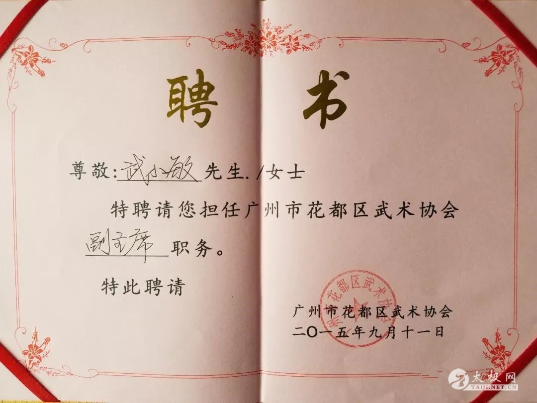 武小敏陈氏太极拳器械表演 武小敏,太极拳发源地陈家沟人,中国武术六段、中国武术段位考评员和指导员、国家一级社会体育指导员、一级拳师、国家二级武术裁判、中国武协会员、焦作市优秀太极之家、陈家沟太极拳研究会副会长、广州市花都区武术协会副主席、广州市花都区太极拳协会副会长、陈志强太极拳推广中心主任。 被焦作市体育局和焦作市妇联评为“优秀太极之家”称号。 2007年 10月,陈家沟全国太极拳邀请赛获陈氏太极拳金牌(第一名)、陈氏太极剑金牌(第一名)。 2008年3月,培训广州市花都区第三届老年人运动会100多名参赛运动员太极拳。 2008年4月,被广州市花都区第三届老年人运动会太极拳比赛聘为裁判员。 2008年8月,由广东省体育局在广州市第二文化宫体育馆举办的“广东省传统武术项目锦标赛”获得传统太极拳一等奖、传统太极短器械一等奖、陈氏太极拳竞赛套路一等奖。 2008年带学生参加广东省传统武术锦标赛获得26枚金牌、67枚银牌。 2008年培训广州市花都区法院100名多干部职工学太极 2008年10月,陈家沟全国太极拳邀请赛获陈氏太极拳金牌、陈氏太极剑金牌。 2009年3月,温县体育局授予“优秀教练员”称号。 2009年8月,由广东省体育局在广州体育学院体育馆举办的“广东省传统武术项目锦标赛”获得传统太极拳一等奖、传统太极短器械一等奖、陈氏太极拳竞赛套路一等奖、24式太极拳一等奖。 2010年7月,由广东省体育局在广州体育学院体育馆举办的“广东省传统武术项目锦标赛”获得传统太极拳一等奖、太极拳规定套路陈氏一等奖、太极拳规定套路16式一等奖。 2010年12月,被广州市花都区第六届运动会太极拳比赛聘为裁判员。 2011年3月,“武德杯”第九届香港国际武术节获得陈氏太极拳传统类第一名。 2011年8月,由广东省体育局在广州体育学院体育馆举办的“广东省传统武术项目锦标赛”获得传统太极拳一等奖、规定陈氏太极拳一等奖、传统太极短器械一等奖。 2012年8月,由广东省体育局在广州体育学院体育馆举办的“广东省传统武术项目锦标赛”获得传统太极拳一等奖、传统太极短器械一等奖。 2014年10月,广州市花都区第七届运动会太极拳械比赛中获得太极拳第一名、太极器械第一名。 2015年9月,当选广州市花都区武术协会副主席。 2015年10月,由中国武术协会在河南温县举办的“全国武术太极拳公开赛”武小敏获得陈氏太极拳一等奖(第一名)、陈氏太极剑一等奖。 2016年2月,温县体育局授予“先进工作者”称号。 2016年5月,广东省陈氏太极拳精英赛中授予“优秀裁判员”称号。 2016年7月,广东省武术协会在海珠区全民健身活动中心举办的“广东省第九届武术精英大赛暨《中国武术段位制》中段位技术考评”获得陈氏太极拳金奖、陈氏太极剑金奖。 2016年8月,中国武术协会在佛山岭南明珠体育馆举办的“世界太极拳健康大会”武小敏获陈氏太极拳一等奖、陈氏太极剑一等奖。 2016年8月,广州市花都区武术精英赛被聘为裁判员。 2016年10月,广东省武术协会在花都举办的中国武术中段位晋级考试中被聘为考评员。 2017年7月,广东省第十届武术精英大赛获得陈氏太极拳金牌、陈氏太极剑金牌。 2017年8月,广东省武术协会在花都举办的中国武术中段位晋级考试中被聘为考评员。 2017年10月,广州市花都区青少年传统武术锦标赛被聘为裁判员。 2017年11月,中国武术协会在佛山岭南明珠体育馆举办的“全国传统武术比赛”获得陈氏太极拳一等奖、陈氏太极剑一等奖。 2018年8月,广东省武术协会在广州举办的中国武术中段位技术考评中被聘为考评员。 2018年9月8日,广州市花都区太极拳协会成立,当选副会长。 2018年10月13日,带领40多名学员参加国家体育总局登山运动管理中心、中国登山运动协会、湖南省体育局、湖南省旅游局主办的,中国户外健身休闲大会(东江湖站)暨“雾漫小东江”国际半程马拉松赛,分别在开幕式和狂欢晚会上表演陈氏太极拳械。 2018年10月18日,带领60多名学生参加在花都体育馆举办的广州市花都区第八届运动会暨第四届残疾人运动会开幕式群狮太极《刚柔和风》大型表演。 2019年2月,温县武术工作会议在县政府会议室召开 ,被评为“先进个人”,陈志强太极拳推广中心被评为“先进单位”称号。 2019年7月,广州市花都区校园武术精英大赛被聘为裁判员。 2019年8月6日,应邀参加韶关市曲江区“全民健身日”系列活动启动仪式暨比赛,作为嘉宾和比赛仲裁委员会委员出席。 2019年9月10日,成功组织近300名会员在广州市花都区东风体育馆广场举办,一带一路太极行 • 广州站。 2019年9月12日,组织学员参加由广州市花都区纪委、区人社局、区团青委在花都区政府礼堂举办的“践行家风传承,创造美好生活!”活动,表演太极书法《家风万世传》节目。 2019年9月21日,成功组织举办广州市花都区太极拳协会周年庆典活动,有200多名会员参加。 责任编辑:太极网小闫 |