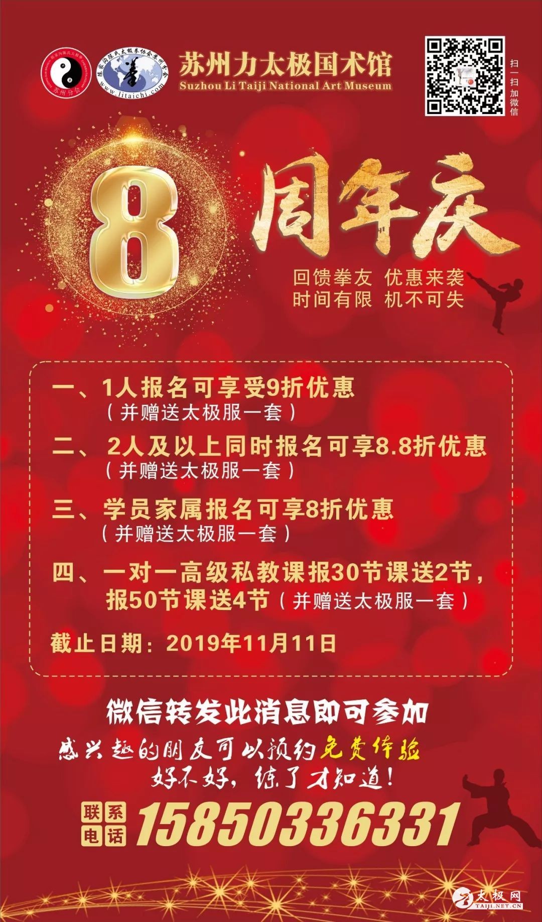 苏州力太极国术馆(陈家沟陈氏太极拳协会苏州分会)自2011年11月11日开馆至今,受到了广大太极拳爱好者的一致好评,为了庆祝在开馆八周年,感谢广大的拳友和朋友的支持和厚爱,特推出周年庆限时优惠。