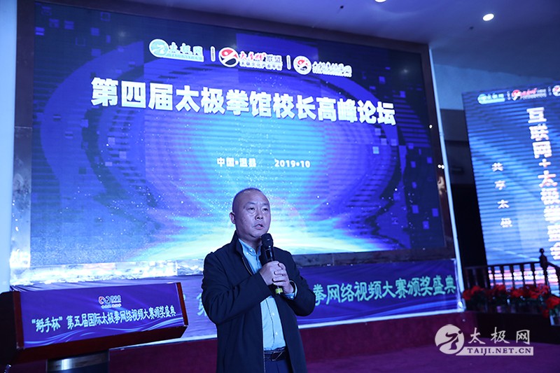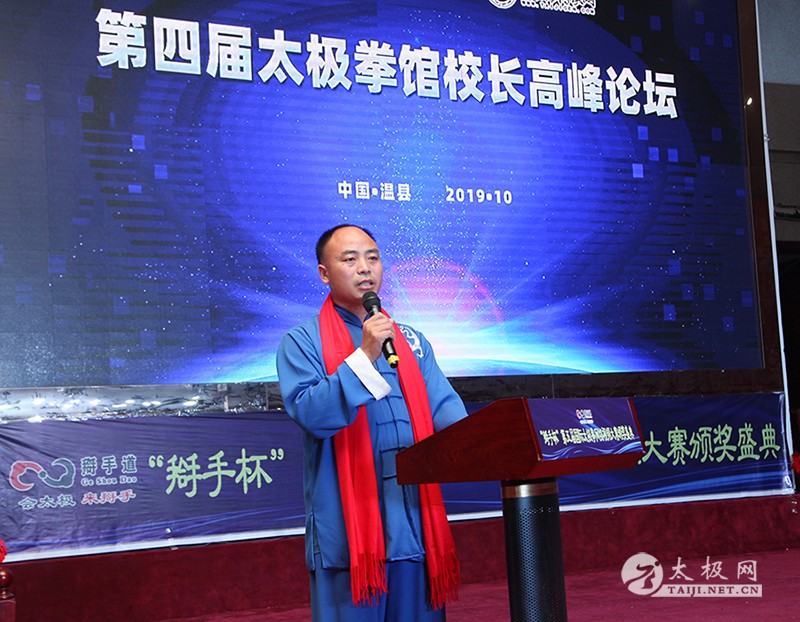 (太极网讯)打造太极文化产业平台,共享太极文化传承发展!10月19日,“互联网+太极拳”年度盛会、2019“搿手杯”第五届国际太极拳网络视频大赛颁奖盛典在太极圣地中国温县隆重举行。当天下午,由太极网、大拳师联盟、太极拳传承网发起主办的第四届太极拳馆校长高峰论坛在温县海旺酒店太极演武厅同步举行,论坛旨在积极响应大力推广太极拳及太极文化产业发展的政策号召,邀请了全国各地的优秀太极拳馆校长、各流派太极拳名师名家、武术专家学者,现场500余人共襄盛会,与会嘉宾就太极拳武术文化发展现状、传承与传播及产业发展等主题展开研讨,共商太极发展大计,寻求太极文化传播新途,为传播太极、兴盛产业、健康大众等共同献计献策。 太极网创始人、国际太极拳网络视频大赛组委会主任刘洪奇,石家庄武术协会主席、石家庄陈氏太极拳学校校长兼总教练杨合发,深圳大美投资有限公司董事长刘洪恩,太极网首席武术导师、上海礼太极运动与养生研究院院长解礼德,山西致中太极拳俱乐部馆长兼总教练范德治,长垣太极功夫学校校长王胜伟、港中旅保险经纪公司总经理助理兼河南分公司总经理李守勋、山东老年体协太极拳委员会副秘书长、书法家刘国明别进行了主题演讲,太极网总编李超主持论坛。 嘉宾们各抒己见、高谈阔论,活动现场提出了许多关于太极拳传承发展的创新论点,尤其是针对武术产业跨界发展、青少年太极拳推广等论题提出了建设性思路。 太极网创始人、国际太极拳网络视频大赛组委会主席刘洪奇致欢迎辞。刘洪奇简要论述了当前各地太极拳馆校生存与发展现状以及面临的问题。围绕当前太极拳推手现状及未来发展,刘洪奇就太极网重磅打造的“搿手道”平台展开推介,“搿手道”是一项全新的全民实战对抗表演赛事平台,分为推手表演赛和推手对抗赛等,将打破传统推手赛事一味追求对抗而丢失观赏性与趣味性等发展瓶颈,通过重新挖掘和定义“推手”,成为所有太极人都能参与的运动。“搿手道”的发展将联合各地太极拳馆校长合作共建,依托互联网进行相关产业推广。 作为一代太极拳大师马虹支系的领军人物,近年来“马虹精神”“马虹支系”在杨合发等众多优秀太极拳传承人的带领做出了非凡成绩,成为当代太极拳传播领域的中流砥柱。杨合发就“如何做好一名合格的传承人”主题展开演讲,他特别强调尊师重道,在传承太极拳时应忠诚继承、精研力践、热忱传播、造福人类,在继承、传播和弘扬太极拳的道路上更应一丝不苟、扎实前进、无私奉献、无怨无悔。 太极拳产业的发展需要更多跨界与融合,需要更多其他行业领军人物的参与和支持。深圳大美投资有限公司董事长刘洪恩从一位资深投资人、太极人的角度展开演讲,他高度赞誉“搿手道”项目的未来发展前景可期,并在产业化运作模式方面提出建议。刘洪恩表示,太极拳作为中华优秀传统文化的杰出代表,在当前新时代发展要求下,需要做情怀,也要做产业! 作为太极网的老朋友、战略合作伙伴,上海礼太极运动与养生研究院院长解礼德再次应邀演讲。他就“如何把太极拳与养生的关系”主题进行分享,针对当代人生活方式,他认为练习太极拳是一条已经被高度论证和认可的、极为可靠的健康之路。他称赞太极网是全球太极人的家园和大舞台,在“互联网+太极拳”领域有着时代引领性的创新与贡献,期待广大拳师朋友共享平台,抱团发展,合作共赢。 文化和旅游,太极和远方!港中旅保险经纪公司总经理助理兼河南分公司总经理李守勋是旅游行业的资深专家,他从旅游发展的角度,就“太极+”及赛事活动跨界运作阐述了新论点,通过转化“广场舞”“跆拳道”拓宽太极拳受众群体等方面提出呼吁。 太极圣地、山水焦作,天下太极一家亲!在活动前夕,太极网联合山西致中太极拳俱乐部在焦作云台山开办了一期极具意义的杨氏太极拳培训班,致中馆长兼总教练范德治老师应邀演讲。他就拳馆产业化经营与太极拳传承之间如何平衡等问题进行分享,太极人应跟上时代的步伐、与时俱进,将太极拳推广与社会发展和人民群众需求紧密结合在一起,太极拳教学与互联网共享,对于太极拳馆校建设和发展具有重大意义。为进步做大、做强太极拳传播与产业,他建议和呼吁太极网牵头搭建平台,联合各流派太极拳名师名家在全国展开巡回推广活动。 王胜伟演讲 长垣太极功夫学校校长王胜伟致力于青少年武术教学与产业发展十余载,有着丰富的行业经验,极具代表性。他从“太极拳进校园”“青少年学习太极拳的好处”以及“青少年太极产业生态圈”等议题展开论述,分享教学经验,交流推广心得,赢得现场嘉宾的高度认可和积极响应互动。 “互联网+太极拳”已成为当前发展大趋势,太极网自1997年创立至今与各流派太极拳名师名家建立了深厚的友谊与合作关系,近年来旗下大拳师直播间吸引了诸多太极名师加入,在太极拳在线教学推广领域成果颇丰,山东易和太极拳馆馆长刘国明正是大拳师直播间的主讲名师,其教学受到了全国拳友的热烈欢迎。刘国明是杨氏太极拳传承人,同时也是著名书法家。他就太极拳与健康的关系、太极拳与传统艺术关系进行论述,文化互鉴交融,促进太极拳传播与发展大格局。 现场演讲内容丰富、主体鲜明,或围绕太极拳传播推广分享