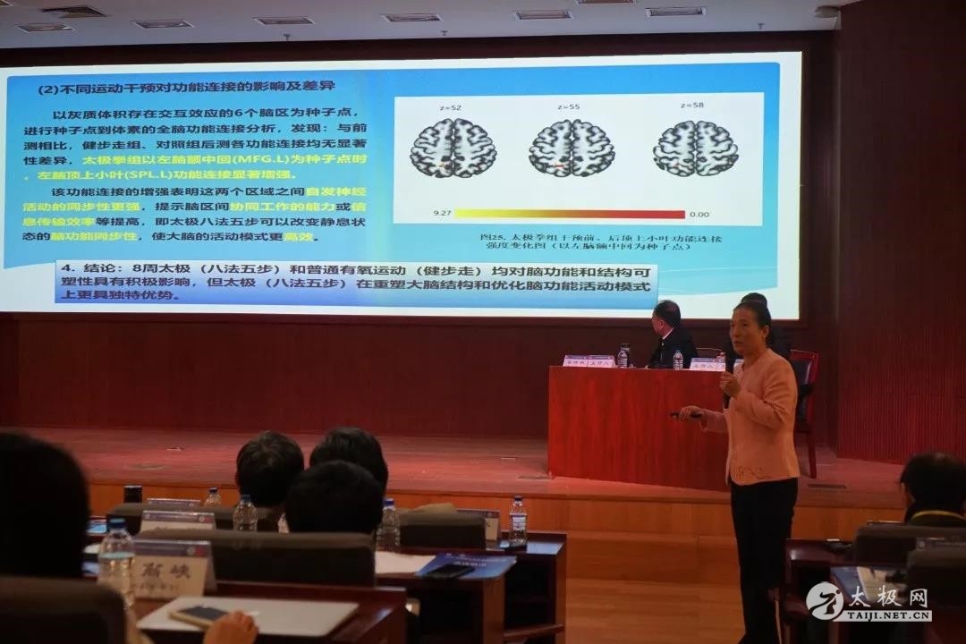 她与大家分享了她带领课题组采用太极(八法五步)运动干预,综合运用心理测量、多模态脑成像技术(ERP、fMRI、sMRI、DTI),多层面、多视角开展的“太极拳对健康作用的脑机制”系列研究的部分成果。报告引起了与会者的广泛关注与共鸣。