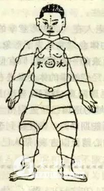 (一)无极桩的缠丝劲的走向 大家从下图中不难看出,一是先说两脚.两腿的缠丝劲都是逆缠丝,因为两脚发下踩力时,两脚内侧的力大于两脚外侧的力; 力发原于两脚内侧,即逆缠丝也。再说两腿放松微微下屈,两膝盖微外撑里扣,形成两大腿肌肉由后向前翻裹,两腿同时形成了双逆缠丝劲;二是两腿间的逆缠丝,就像两根绳子,缠丝劲继续向后上走,通过臀部交叉,敛臀,尾骨内收;继续逆缠通过两胯,逆缠交叉到丹田部位,这时胸腰放松,丹田自然鼔荡;继续逆缠通过胸腰两侧逆缠丝交叉与命门,命门打开后撑,有一种巨大的逆缠捧力,双绳从两肋向前逆缠丝到中丹田部位交叉,形成含胸拔背,檀中穴内涵,形成外形饱满内部鼔荡,膨胀力十足的放松形态。三是两股缠丝劲分别走两腋下,由后向前绕缠绕臂,两臂形成双逆缠,虚腋两肘略略向前裹捧,两手中指贴裤线,大指微领劲,双臂形成逆缠丝;四是头部,头在全身逆缠丝劲的触动下,头部是虚领顶劲;那么,我要告诉大家,预备式,无极桩功的缠丝劲,从脚下到头上,处处都是逆缠丝,我个人认为只有浑身上下全是逆缠丝,身体才具有膨胀螺旋缠绕力。要练好陈式太极拳的缠丝劲,首先要明白浑身有哪些缠丝劲,即全身上下、左右、内外无一处不缠,在行拳时而又以躯体的缠丝为主要,通过腰脊的螺旋转动和胸腹的折迭运化来带动和贯穿上下四肢的螺旋缠丝,从而达到周身一家的整体力量。如下图所示