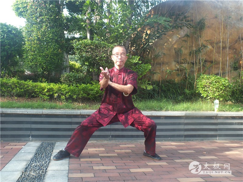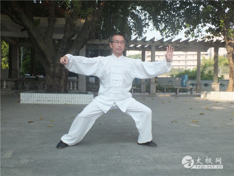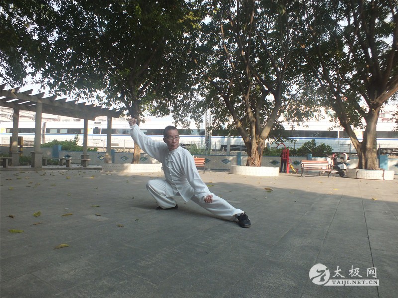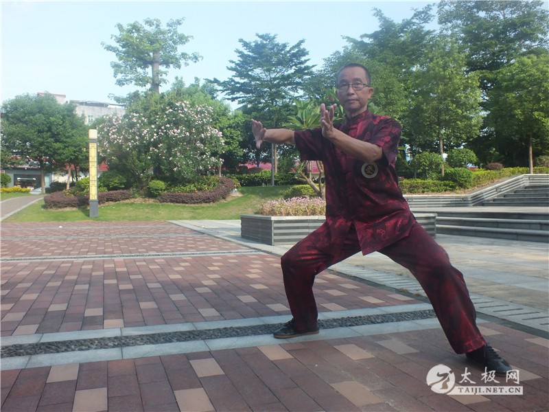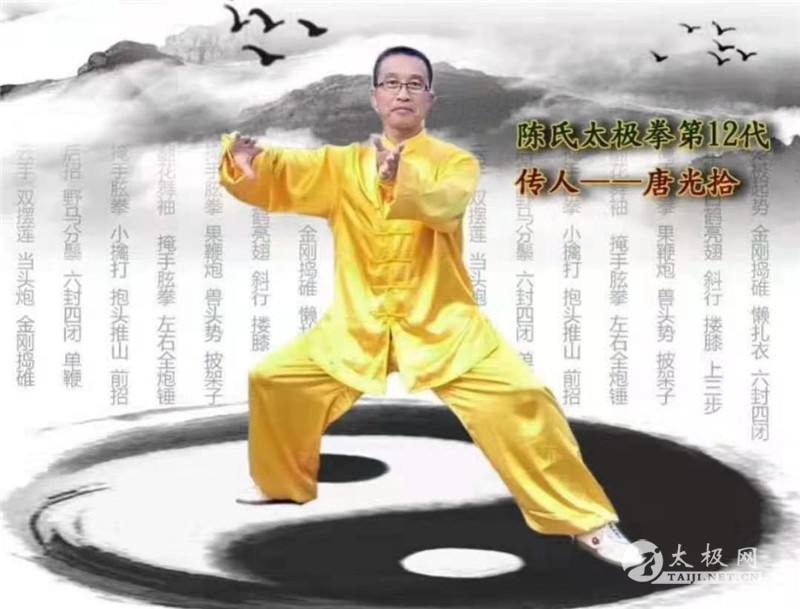 唐光拾拳照 唐光拾说:我是从《武林》杂志上看到陈启旺老师“太极之家”的报道后,1981年慕名来到温县陈家沟拜陈启旺为师学练陈氏太极拳,学习陈式老架一路、二路。1983年邀请陈启旺来防城授拳,跟随他学习陈式太极单刀、单剑、推手。他被太极拳那连绵不断、行云流水的拳术风格以及螺旋缠绕、刚柔相济的神韵所吸引,唐光拾越来越想更加深入的了解太极拳的精髓。之后,他反复七次前往陈家沟学拳,经历数十年练拳生涯与磨砺,唐光拾终于做出了一点成绩。