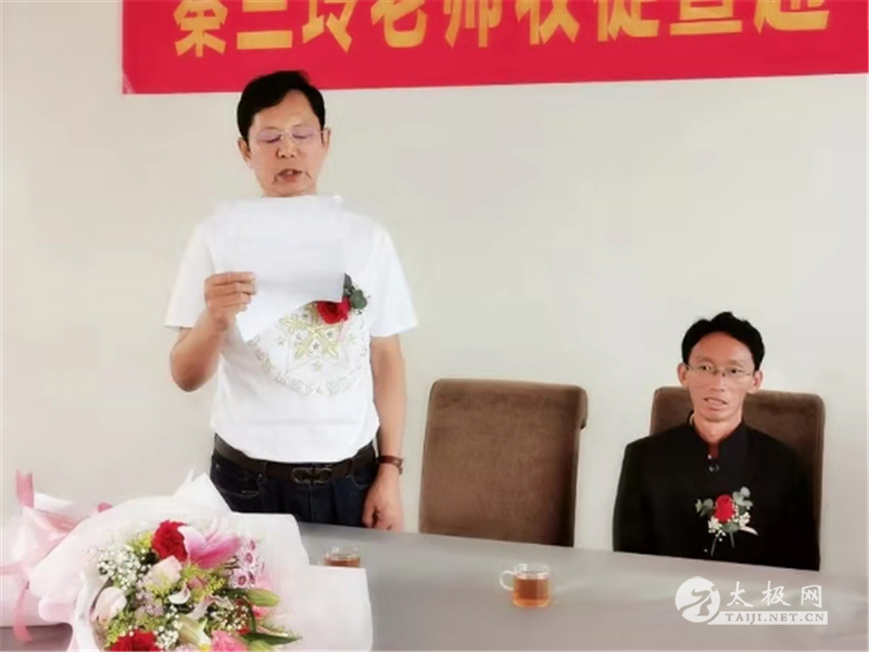 参加仪式的嘉宾与部分弟子合影 2019年12月25日,陈氏太极拳名家秦兰玲老师收徒仪式在美丽的三亚举行。赵书佩、林应强通过传统的拜师仪式拜入秦兰玲门下,正式成为陈式太极拳传承人,将承担起传承太极、弘扬太极文化的责任。 入门弟子赵海率新入门弟子赵书佩、林应强宣誓 收徒仪式遵循传统,简洁庄重。入门弟子赵海率新入门弟子赵书佩、林应强宣誓,新弟子向师父递交拜师贴,师父回帖。在众人的见证下,拜师仪式圆满完成,两位新弟子也正式成为陈式太极拳传承人。 司品辉在收徒仪式上讲话 三亚市武术协会司品辉主席到场祝贺,他高度赞扬了秦兰玲老师为传播中华民族优秀太极文化做出的贡献。 刘春彦宣读杜德平主席贺电 北京市武术运动协会杜德平主席发来贺电,祝贺秦兰玲老师再收两位德艺兼优的弟子。他寄语秦兰玲老师在三亚武术协会副主席岗位上,做出更加优秀的成绩。 新入门弟子代表发言 秦兰玲老师讲告诫弟子们要牢记杜德平主席“傻坚持、死认真、多出汗、勤悟理”习武练拳之格言。 收徒仪式结束后,司品辉为三亚秦兰玲太极拳辅导中心2019年度“先进工作者”“优秀运动员”“优秀教练“”优秀会员”颁发奖状。 本站责编:张欢 |