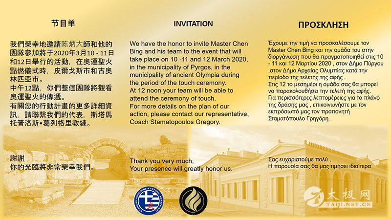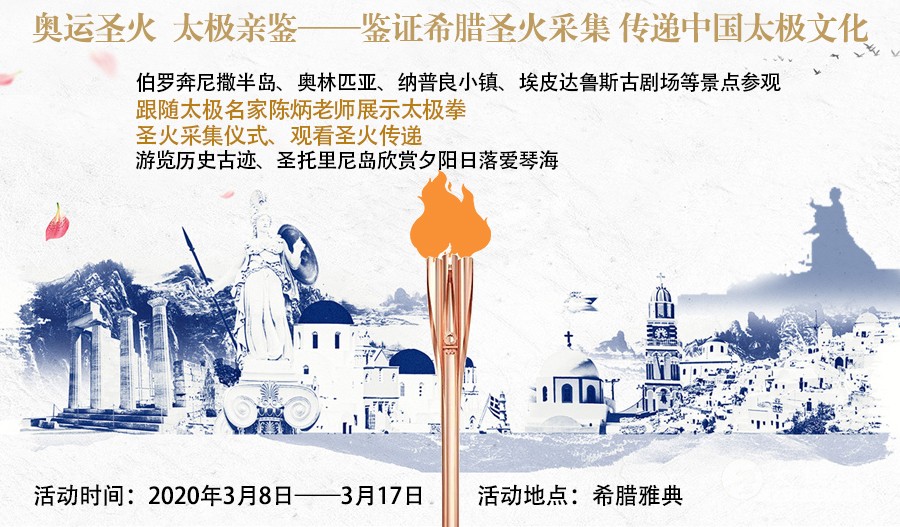 太极拳,源于中国,属于世界!适逢2020东京奥运会圣火采集仪式于希腊举行,应希腊武术功夫协会之邀,陈氏太极拳第十二代嫡宗传人、联合国青年陈氏太极拳形象大使陈炳先生将于2020年3月前往希腊奥林匹亚市参加第32届夏季奥运会圣火采集仪式及其它庆祝活动。同时应希腊武术功夫协会邀请组建中国太极文化使者代表团前往参加系列主题活动,旨在在奥运会主题活动的国际舞台上展示中国太极文化,助力太极文化世界行。 这是2019年8月20日中国太极功夫文化旅游“一带一路”万里行活动首站(雅典站)启动仪式上中国太极功夫与西方古老文明的首次融合以及首个落地活动。 一、活动背景 1.中国太极功夫文化旅游“一带一路”万里行活动首站于2019年8月20日在雅典启动,获悉联合国青年陈氏太极拳形象大使陈炳先生莅临雅典,希腊奧林匹亚市市长特别委托希腊武术功夫协会教练Stamatopoulos专程赶来,希望加强武术文化交流,助推以太极拳为主的中国功夫早日成为奥运会正式比赛项目,助推太极拳早日成为人类非物质文化遗产。 2. 2020年是奥运年,东京奥运会将于2020年3月11日-12日于奥运会发源地—奥林匹斯市举行奥运圣火采集仪式。 3. 希腊是欧盟国家中较早支持并参与“一带一路”倡议的国家。 二、希腊官方邀请函 (希腊武术功夫协会邀请函) (希腊武术功夫协会授权) 三、活动意义 展示太极文化:响应国家倡议,坚持交流互鉴,向全世界展示伟大古老文明的和合之美,作为太极文化使者增进“一带一路”文化交流和合作。 鉴证圣火采集:朝圣古奥运发源地,亲历奥运圣火采集仪式,感受奥运现代荣光,传递体育正能量。 四、活动详情 1. 参与为圣火采集仪式举行的游行活动,展示太极拳魅力,彰显中国武术风采,展示太极人健康、优雅风貌。 2. 活动摘要 游行活动环节:陈炳先生带领团队进行太极展演。 圣火采集现场:陈炳先生作为希腊武术功夫协会特邀嘉宾全程出席采集仪式,中方代表团全体成员共同见证圣火采集仪式。 研讨活动现场:陈炳先生教授中国太极拳。 游行活动现场:参与中国、希腊、日本国旗游行活动,传递国际友谊。 古典奥运现场:太极表演,打卡奥运地标。 五、宣传媒体 ERT频道:希腊最大的电视频道。 太极网:创立于1997年的专业太极拳媒体平台,领衔太极文化传播推广20余载。 活动组委会面向全国公开邀请广大太极拳爱好者,招募太极文化使者组团参加此次奥运圣火采集活动,共同传播太极文化,所有参与活动的人员将获得希腊武术功夫协会出具的活动纪念证书。 六、行程安排 活动时间:2020年3月8日——3月17日 3月8日:郑州出发飞北京,搭乘国航班机直飞雅典 -文化使者出发合影 -随队媒体随机参访 3月9日:早上抵达雅典 -雅典市区参观、文化考察 3月10日:雅典-伯罗奔尼撒半岛-奥林匹亚 -纳普良小镇、埃皮达鲁斯古剧场参观 3月11日:在Xystris theme park参加节日游行活动 -跟随太极名家陈炳老师展示太极拳 -部分文化使者将同希腊武术功夫协会队员一起进行诗朗诵《Light of Olympia》 -观看其它表演等 3月12日:圣火采集仪式 -观看圣火传递 -参加研讨会和其它活动 3月13日:同希腊武术功夫协会的朋友一起游览历史古迹 -晚上抵达雅典 3月14日:雅典-圣托里尼 -前往以蓝白小镇著名的圣托里尼岛,欣赏夕阳日落爱琴海 3月15日:继续享受爱琴海的美景,下午乘机返回雅典 3月16日:雅典飞北京 3月17日:抵达郑州,结束愉快的奥运圣火采集亲鉴之旅! 七、费用标准及说明 人数要求:限额81人,优先报名,择优录取 报名截至时间:2020年1月15日 专享费用:16800元 联系人:邓老师 13007659881(微信同号) 费用包含: 1. 邀请及签证费 2. 郑州起始全程国内、国际机票、燃油附加税 3. 行程中所标明酒店及餐饮 4. 全程提供豪华巴士,专业司机 5. 行程中景点大门票费及船费 6. 境外旅行责任险 7. 境外司机、餐厅服务费及酒店服务费 费用不包含: 1. 护照费、申请签证中准备相关材料所需的制作、手续费,如未成年人所需的公证书、认证费 2. 洗衣、电话、饮料、烟酒、付费电视、行李搬运等私人费用 3. 出入境的行李海关课税,超重行李的托运费、管理费等 4. 行程中未提到的其它费用:如特殊门、游船(轮)、缆车、地铁票等费用 5. 公务活动及专业翻译费,转机/火车时用餐 6. 旅游费用不包括旅游者因违约、自身过错、自由活动期间内行为或自身疾病引起的人身和财产损失 八、活动组织 活动主方:希腊武术功夫协会 活动承办:北京鼎甲众承文化发展有限公司——“豫见太极”赛事IP打造者 活动协办:陈家沟国际太极院、北京九格文化传播有限公司、太极网 活动嘉宾: 陈炳先生:陈氏太极拳第十二代嫡宗传人,联合国青年陈氏太极拳形象大使 更多嘉宾筛选邀请中······ 附件: 本站责编:小A |