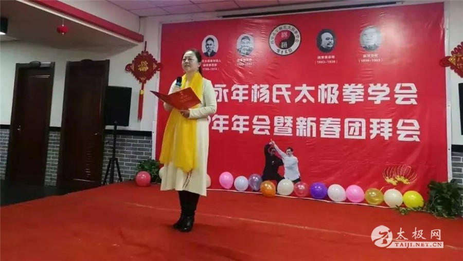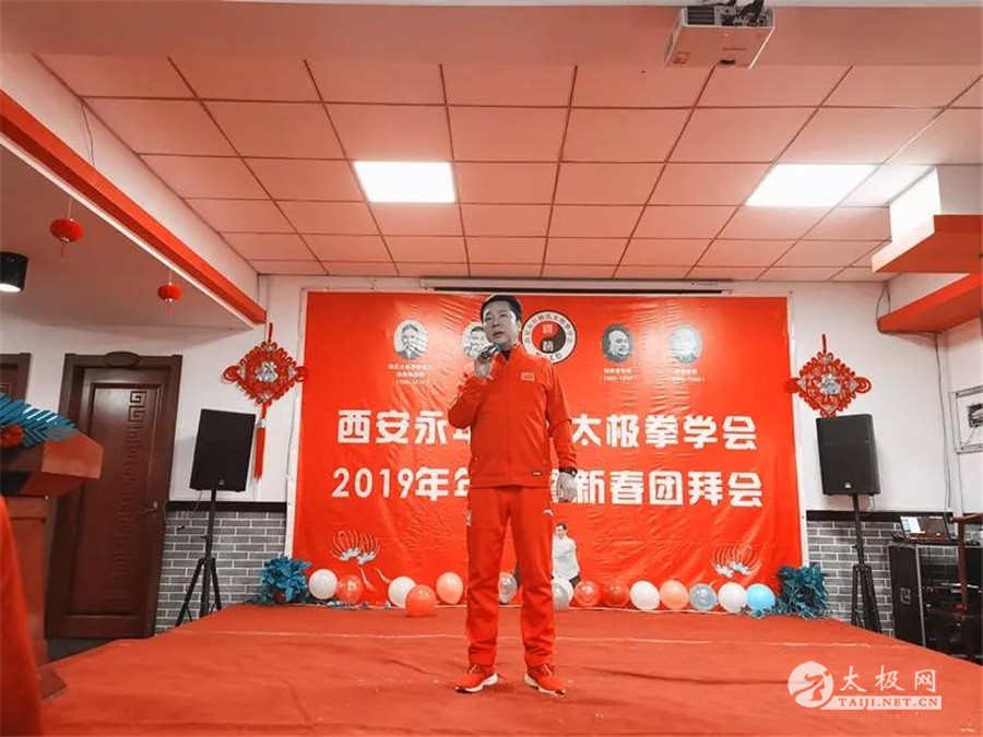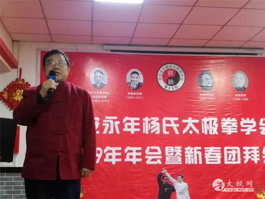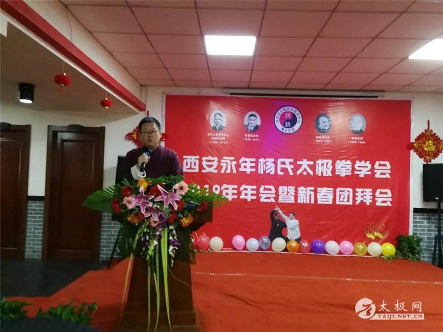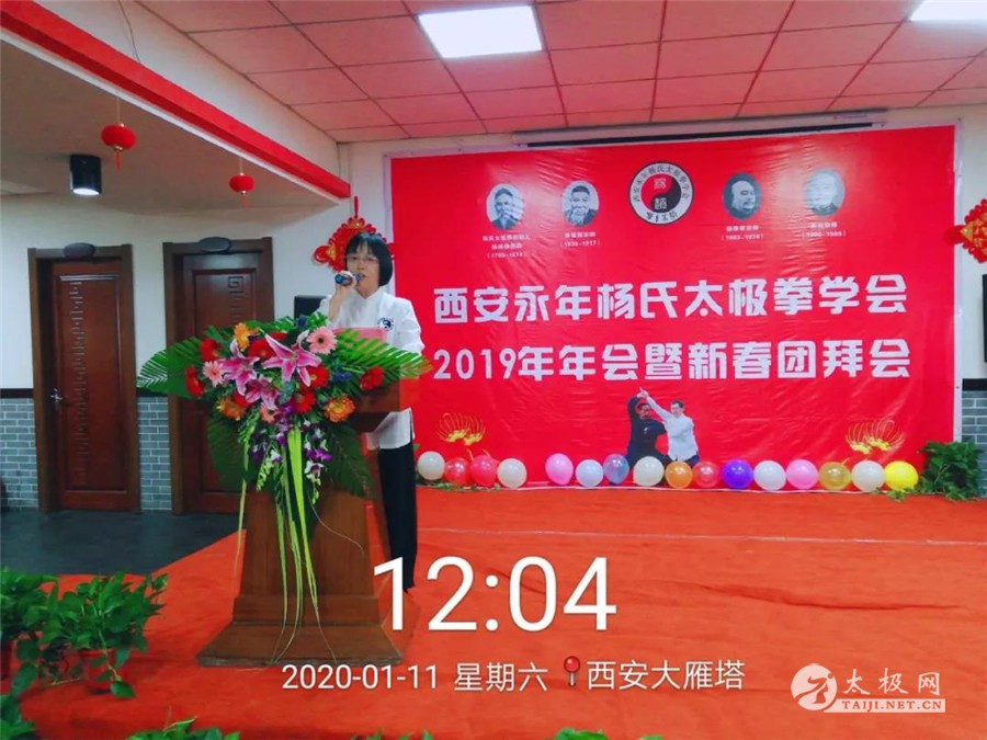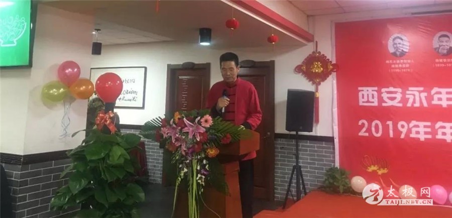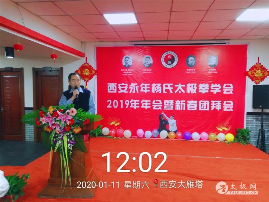 西安永年杨氏太极拳学会常务副会长赵亮老师做学会工作报告。他说,2019年,在陕西省武术协会、西安市武术协会和各级体育局的亲切关怀领导下,学会总体发展形势良好。一年来,通过大量扎实有效的工作,在公益培训、会员发展、举办赛事、参加比赛、全民健身、非遗工作等方面取得了良好的社会效应和口碑,为全民健身和推广太极拳做出很大的贡献。赵亮老师在报告的最后讲到:“2020年,西安永年杨氏太极拳学会将继续积极响应国家全民健身的号召,不忘初心,凝心聚力,努力奋斗,驰而不息。现在我们站在2020年新的起跑线看到了希望,看到了明天的更加辉煌,十载风雨身后事,策马扬鞭向前看。习总书记在新年致辞中倡议:“只争朝夕、不负韶华”,我们学会以“恒专不骄”的箴言、“守诚 处和 持恒 求精”的会训作为我们精神的大旗,继续为杨氏太极拳的正脉承传、为弘扬祖国优秀传统文化、为推动全民健身伟大事业,以海纳百川的气魄,风雨同舟,一路前行,创造更加辉煌的明天!