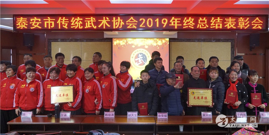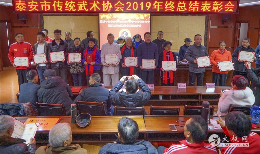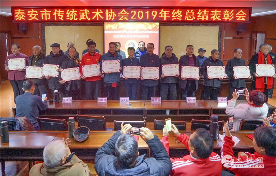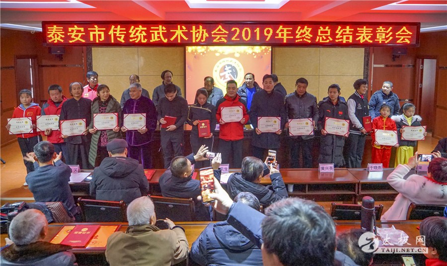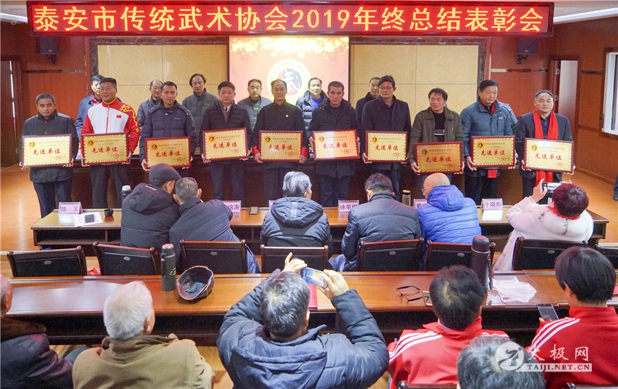2020年1月12日上午九点,泰安市传统武术协会2019年度总结表彰会在更新社区隆重召开。来自各县市区的二十九个单位近四百名武术爱好者参加会议。 活动现场嘉宾 泰安市体育局社会组织总支书记、泰安市体育总会副主席路敦庆 中共更新社区支部书记李孝强 泰山区体育总会主席鲍德心 泰安市太极拳协会主席王增华 泰安市传统武术协会主席王德利 新铁龙工贸有限责任公司总经理武昌 泰安市传统武术协会荣誉主席陈荣玺、郭孝海 泰安市传统武术协会副主席吴晓光主持会议 先进工作者代表刘军发表获奖感言 获得2019年度先进单位的是: 宁阳县龙威八极拳俱乐部 泰安市正德武馆 石横出山拳徐家枪硬气功推广中心 新泰徂阳武术学校 泰安市传统武协宁阳分会 新泰市武协新汶培训中心 泰安市陈式太极拳推广中心 泰安市传统武协新矿分会 新泰市付家拳 保利社区太极拳俱乐部。 优秀传承人代表上台领奖 先进工作者代表上台领奖 优秀教练员、优秀裁判员、优秀运动员、武术童星代表上台领奖 泰安市传统武术协会执行主席孔凡春同志因事无法到会,特发贺词向大家祝福并祝大会圆满成功! 留下美好瞬间
