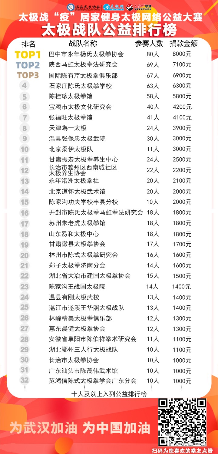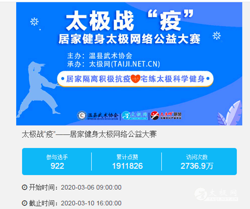 (太极网 讯)2020年春节,新型冠状病毒感染的肺炎疫情席卷全国,一场没有硝烟的举国“战疫”打响了。面对这场举国“健康战”,享誉世界的最完美健身运动之太极拳发挥着不可估量的社会和科学价值,为抗击疫情贡献了巨大力量。为积极响应国家体育总局关于推广居家科学健身的号召,助力全民抗疫,太极拳发源地河南温县积极行动,温县文化广电和旅游局、温县陈家沟景区管理局、温县太极拳武术文化管理中心、温县武术协会和太极网(TAIJI.NET.CN)联合发起举办《太极战“疫”——居家健身太极网络公益大赛》。赛事由温县武术协会主办,太极网承办,以《居家健身 太极战“疫”》为主题,依托“互联网+太极拳”活动模式,积极宣传和倡导广大太极人居家隔离积极抗疫,宅练太极科学健身。 战“疫”当前,刻不容缓!大赛自策划筹备至网络展播,历时仅半月,活动报名不断突破组委会初期设计规模,10天时间即逼近千人,组委会紧急协商后提前截停报名。面对暴增的大赛规模和工作量,组委会提前进入“战时”状态,只争朝夕,不负战“疫”,全体加班加点推进各项工作,为网络展播平台搭建保驾护航。 3月6日8时,大赛全体同台展播如期开启,平台虽早已全副武装待命“受检”,千万太极人的同台交流互动“战斗热情”让人震撼,展播当日平台访问量直线飙升,迅速逼近千万!截至10日收官,5天展播累计网络访问量达2700余万次,投票点赞高达191万次,广大拳友们互动留言频繁刷屏,评论高达2万余条,连续5天刷爆太极人的朋友圈!广大太极人以网为媒,传播太极正能量,为武汉加油,为中国加油! 大赛太极战“疫”公益排行榜 深耕太极文化传播20余载的太极网于2015年创新结合新时代网络媒体生态举办视频大赛,至今连续成功举办五届“国际太极拳网络视频大赛”,领衔太极文化网络传播国际浪潮。在全国上下同心协力抗击新冠肺炎疫情战斗中,太极网吹响战“疫”集结号,引发全球拳友高度关注,各地拳友和太极拳组织千余人踊跃报名,累计收到922部参赛作品,千名拳友在太极战“疫”中,积极献出一份力量,表达自己的“拳拳”爱国之心。 组委会表示,本次大赛全部参赛报名费用累计10万元将进行公益捐赠,团队组织的报名费将以“XXX太极战队”的名义进行捐赠,为抗击新冠肺炎疫情贡献太极力量。大赛评审结束后统一公示成绩,届时大赛组委会还将发布本次大赛颁奖典礼等线下主题活动通知,待花开疫散,邀请广大太极人共贺战“疫”胜利! 大赛组委会 |