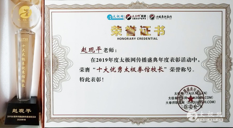 为积极挖掘、表彰、宣传每年度在太极拳传播推广领域表现突出的传承人、拳师,太极网·大拳师联盟发起举办“太极网传播盛典年度表彰活动”。 2019年度获奖名单隆重推出,永年洺洲太极拳社社长赵现平荣膺2019年度十大“优秀太极拳馆校长”称号。 赵现平(1961.1—)又号宪平,月香居主人,杨氏太极拳第五代传人,师承翟文章先生。国家二级武术裁判、国家级社会体育指导员、中国武术六段。现任河北省邯郸市武术协会委员、永年区太极拳协会副会长、永年洺洲太极拳社社长、邯郸市太极拳促进会副会长、永年太极拳联谊总会副主席、邯郸市太极拳委员会副主任、永年廉让堂太极拳研究会常务副会长、中国永年国际太极拳联谊会副秘书长、永年广府太极国术馆高级教练、邯郸广播电视大学体育教育(太极拳方向)专业教师。任河北省太极拳健康学会理事、杨氏太极拳总教练,太极拳研究院研究员、专家委员。 赵现平1972年拜永年太极拳师翟文章习练太极拳、器械、推手和散手。1993年创办永年洺洲太极拳社,曾获永年县民间武术比赛一等奖,杨式太极拳第一名、42式太极拳第一名、太极拳推手第二名、太极拳全能第三名、全国太极拳锦标赛中获刀术第二名、全国杨式太极拳邀请赛获一等奖。 1996年参加全国武式太极拳竞赛套路审定工作,1998年以永年总教练身份带队参加由国家体育局武术运动管理中心主办的天安门广场万人太极拳表演活动。 2017年9月2日,承办2017年世界百城千万人太极拳展演活动(中国▪河北)永年站,五百余人表演太极拳。组织中日韩太极拳交流、健身日、太极拳月,协办河北省邯郸市非遗进万家活动和广平武林大会等大型群众健身活动及大型比赛和对外交流活动。 2002年获中国永年国际太极拳联谊会十一年回顾贡献杯奖,2004年获河北省民办非企业单位先进工作者、河北省先进教师、河北省第二届民间组织先进个人。 2008年被评为全国群众最喜爱的社会体育指导员,2015年评为永年县优秀专业技术拔尖人才,2015年3月被授予邯郸“太极七贤”称号。 近20年来,多次带队弟子学员参加全国各种太极拳比赛活动,获金牌157枚、银牌287枚、铜牌343枚、并多次获团体第一名。美国、德国、法国、日本等国太极拳爱好者前来学习,教授学员近万人,收弟子百余人。 其先后发表太极拳论文三十多篇。其中2002年《浅谈太极拳化与发的要点》一文被评为《太极》杂志十佳论文。2005年《太极拳的通病与纠正方法》一文获全国银奖。《浅谈太极推手化与发的要点》收入《广府城志》和《永年太极拳志》。 2006年创编了《坐式太极拳》,出版了《坐式太极拳图解》教学光盘,在全国太极拳界得以推广。同年成功举办了邯郸市第一届坐式太极拳比赛。近年,编写了《太极拳教练手册》《太极拳推手图解》《杨式太极拳汇编》和《太极拳攻防术图解》。参加了《太极纵横》《中国永年太极拳》光盘录制并担任技术顾问。 2012年受河北杂技频道精武门邀请,连续10集讲授太极推手。 2016年受邯郸电视台新闻频道邀请,在“健康大讲堂”栏目,传讲太极健身养生知识。 2018主办的武动太极迎三八活动在今日头条和邯郸晚报刊登。 2019年《太极》杂志第六期上发表《太极拳十三势用意法》。 其事迹被人民日报、河北日报、邯郸日报等报道,并在各大媒体报道。被载入《世界名人大典》《中国专家人才库》《中国民间武术名典》《中华太极人物志》《当代中华武术精英名录》《永年太极拳志》《永沐光辉中国当代武术名家庆祝建党95周年画册》《一带一路,走向世界的中华名家》等书籍、杂志。 永年洺洲太极拳社由赵现平创办于1993年,发展会员200余名,培养拳师20多名,国家二级社会体育指导员40名,国家一级社会体育指导员30名,国家级社会体育指导员15名,二级武术裁判7名,中国武术六段11名,传授学员5万多人次。每年被评为县市群体工作先进单位、邯郸市先进社会指导站。 永年太极广场、洺州公园,今朝为洺洲太极拳社晨练基地,坚持常年义务教拳,每年定期举办4期太极拳培训班,2期推手培训班。 2019年2月2日组织拳社参加永年区委宣传部、文化广电和旅游局主办的乐享河北▪非遗遇上春节活动。 2019年3月7日早组织拳社妇女在太极广场表演太极拳和太极刀庆祝三八妇女节的到来,并在今日头条以河北永年武动太极迎三八。 2019年3月亲自主教太极刀开班,学员100余人。 2019年3月22日代表永年区参加韵动邯郸·2019全民健身系列活动启动仪式暨全民健身展示活动。 2019年4月20日永年区宣传部主办的万名干群健步走共建全国文明城,在开幕式上表演太极拳。 2019年5月7日,洺洲太极拳社300余人在洺洲剧院广场举行世界太极拳月活动,庆祝第十九个世界太极月。 2019年5月5日接待四川省太极拳社团一行到永年寻根研学太极拳。 2019年5月15日参加永年区世界太极拳月暨太极拳进学校、进社区活动。 2019年6月举办杨氏38式太极拳教练培训班,60余太极拳爱好者参加。 2019年7月-10月举办了6场人民太极健身中国大行动。 2019年8月8日,参加永年区全民健身日活动,洺洲拳社100人的杨氏太极刀、广场队和阳光队100人的武式太极拳表演。 2019年8月,开班培训杨氏太极双手刀,28名太极拳爱好者参加大赛。 2019年9月,在永年太极广场开办杨氏54式太极剑班,学员50余人。 赵现平利用星期