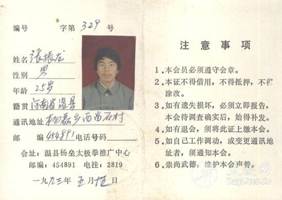 接触太极拳,还要说起他本村的一位大名鼎鼎的人物——张中伏。张中伏是国际太极拳大师陈小旺早期最得意的弟子之一,却四十多岁英年早逝,有人说是因为练功太刻苦,阴阳失衡,经脉逆转所致。张中伏病危的时候,村里的人们都说,他的病只有陈小旺来了才能救他,才能施功帮他打通经脉,但陈小旺在世界上周游,可惜没人知道他在什么地方。张振龙说,他上小学就跟张中伏学习太极拳,他的功夫的确很好,人们对于他的死只是猜测和传言,他真正的病因是家族遗传疾病,导致肾脏衰竭不治身亡。   [page]