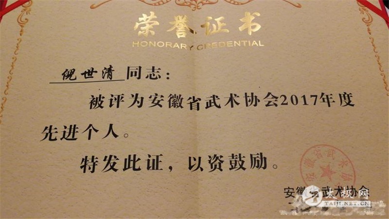 倪世清老师被安徽省武术协会评为2017年度先进个人