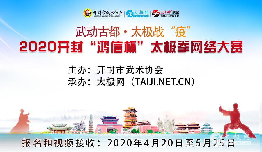 开封市武术协会文件 汴武字〔2020〕6 号 关于举办 2020开封“鸿信杯”太极拳网络大赛的通知 全市(县)各太极拳辅导站: 为认真贯彻和落实国家十四部委出台的《武术产业发展规划》,大力推行全民健身,积极开展各种形式太极拳活动文件精神,在全民抗击疫情中,从一个侧面展现出武术太极人的魅力。为此,将由开封市武术协会主办,太极网承办,以及愿意参加本次大赛的企业、商家、景区等共同联合举办2020开封“鸿信杯”太极拳网络大赛,弘扬太极正能量,为取得战“疫”最后胜利加油。 开封市武术协会 2020年4月16日 2020开封“鸿信杯”太极拳网络大赛竞赛委员会 主任: 李德祥 开封市武术协会主席 执行主任: 刘洪奇 太极网创始人、温县太极拳传承人联合会主席 委员: 时进明 开封市武术协会名誉主席、武术七段 李建设 开封市武术协会副主席、武术六段