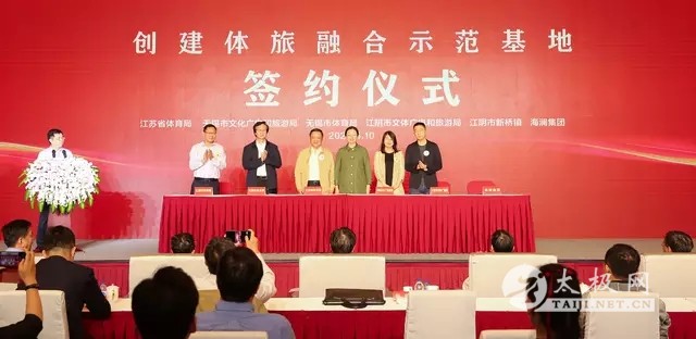 江苏省体育局处长陶新、无锡市文化广电和旅游局局长蒋蕴洁、无锡市体育局局长黄浩然、江阴市文体广电旅游局局长周晓虹、江阴市新桥镇党委书记顾文瑜、海澜集团总裁周立宸共同签署,联合打造体旅融合示范基地。