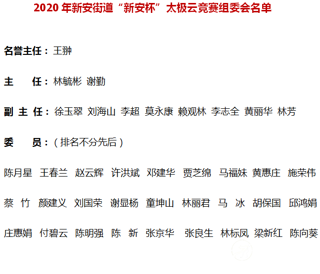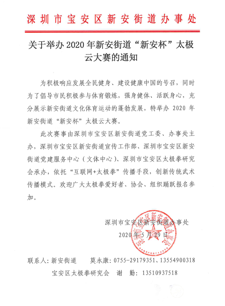 为积极响应发展全民健身、建设健康中国的号召,同时为了倡导市民积极参与体育锻炼,强身健体、活跃身心,充分展示新安街道文化体育运动的蓬勃发展,特举办2020年新安街道“新安杯”太极云竞赛。 此次赛事由深圳市宝安区新安街道党工委、办事处主办,深圳市宝安区新安街道宣传工作部、深圳市宝安区新安街道党建服务中心(文体中心)、深圳市宝安区太极拳研究会承办,依托“互联网+太极拳”传播手段,创新传统武术传播模式。欢迎广大太极拳爱好者、协会、组织踊跃报名参加。 2020年新安街道“新安杯”太极云竞赛规程 一、活动组织 主办单位: 深圳市宝安区新安街道党工委、办事处 承办单位: 新安街道宣传工作部 新安街道党建服务中心(文体中心) 深圳市宝安区太极拳研究会 网络运营: 太极网(TAIJI.NET.CN) 二、活动时间 (一) 报名和视频接收:2020年6月1日至6月20日。 (二) 大赛全体同台展播及网络投票:6月26日至6月30日。 (三) 专家评审及成绩公布:7月中旬。 (四) 颁奖:为避免大规模聚集,所有获奖证书及礼品统一快递。 三、参赛对象 各地太极拳爱好者、协会、组织、团体等。 四、竞赛项目 (一)个人拳术类 1. 传统项目:陈式、杨式、吴式、武式、孙式、和式、游龙拳、其他传统太极拳。 2. 规定项目:陈式56式太极拳、杨式40式太极拳、24式太极拳、42式太极拳、吴式45式太极拳、武式46式太极拳、孙式73式太极拳、八法五步。 (二)个人器械类 太极单器械、太极双器械、功夫扇等。 (三)集体项目 集体太极拳术、集体太极器械、太极拳械混编。 五、竞赛规则 (一)本次网络视频比赛采用中国武术协会审定的2012版《传统武术套路竞赛规则》及有关补充规定。 (二)除太极拳及八法五步技术标准之外,视频的拍摄环境与技术、表演服装、后期剪辑及配乐等均构成参赛节目加分要素。 (三)每名运动员只能代表一个队伍,也可以个人名义参赛,每名运动员限报3项:个人2项和集体1项或者个人1项和集体2项,且2项须不同项目(不能同时2项拳或2项器械)。 (四)集体项目展示人数8人-16人,不足或超出人数不予评比,为更好体现运动员风采,队形可采用2-3-3或其他站位。 (五)项目时间 1. 太极拳类(包括拳械混编):完成套路时间不超过6分钟。 2. 太极器械类:完成套路时间不超过4分钟 (六)年龄分组 少儿组:18周岁以下 成年组:18周岁至60周岁 老年组:60周岁以上 六、参赛影像要求 (一)参赛作品要求为参赛队伍或个人近期演练的视频影像,严禁参赛者采用任何不良手段参与本次大赛,严禁冒用他人名义和影像资料以及使用已经公开发行的音像制品等参赛。 (二)视频要求清晰流畅,图像稳定,参赛视频质量差或不符合标准的,谢绝参赛,手机拍摄时一律采用横向拍摄。 (三)因赛事标准统一和宣传,组委会有权对参赛视频进行剪辑并添加片头片尾,并体现参赛个人和所属组织,同时对不符合要求的视频片头片尾进行修改调整。 (四)凡有悖社会公德或含有违反相关法律规定的图文影像将被取消参赛资格;画面禁止包含他人权利的商标标识、商业招牌、广告植入等,风景名胜区、文化场馆等公益性场所以及太极拳馆等展示除外。 (五)参赛者提供的视频版权、肖像权自负,主办方不承担因参赛作品导致的包括但不限于肖像权、名誉权、隐私权、著作权、商标权等纠纷而产生的法律责任。 七、传播平台 (一)搭建网络视频大赛展播及网络投票平台,方便拳友互动交流。 (二)太极网及手机客户端“太极拳APP”均设置网络视频大赛专题展播栏目,并在其他各大视频网站发布传播。 (三)官微“太极拳” (cntaijiwang)设置专题展播, 八、参赛视频提交 (一)视频展播顺序根据参赛作品提交先后顺序排列展示。 (二)通过联系组委会或太极网下载获取报名表(模版见附件)后完整填写,与视频文件一并发送至组委会。视频文件和参赛报名表的文件名需一致,命名格式为:队伍名称+套路名称或者个人姓名+套路名称。 (三)为保证视频文件的完整性,确保视频正常播放,参赛者以收到组委会正式回复为提交完成。 (四)参赛作品直接以QQ、邮箱、网盘等形式发送电子版。 QQ传送及邮箱接收:20863719、20863719@qq.com 上传至优酷,或百度、360等云盘时,参赛人需提供账号及密码,供组委会登录下载。 九、评选及奖励办法 (一)个人项目按个人拳术类传统项目、个人拳术类规定项目、个人器械类等3个项目分年龄组别分别设置一等奖(按30%比例录取)、二等奖(40%)、三等奖(30%),录取比例按照实际人数采取四舍五入,个人项目颁发奖牌、证书。 (二)集体项目不分年龄组别,按集体太极拳术、集体太极器械、太极拳械混编等3个项目设置一等奖(按30%比例录取)、二等奖(40%)、三等奖(30%),颁发奖杯和集体证书。 (三)同时个人项目按成绩排序少儿组取前3名、成年组取前6名、老年组取前6名(不分拳/器械组别),各奖励¥500元。 (四)同时集体项目(不分组别)按成绩排序取前6名,各奖励¥1500元。 (五)依据大赛全体同台展播的网络投票结果,为总票数排名前5名和人气排名前5(网络首页展示排名)的个人颁发最佳人气奖,颁发奖金¥500元。 十、评审细则 (一)大赛评审规则与场地赛规则略有不同,组委会秉承公平公正原则,严格按照视频大赛评审要求进行。 (二)评审标准包含技术分100分(专家评审)、人气分10分(网络投票)、按总分统计结果,按比例评选出