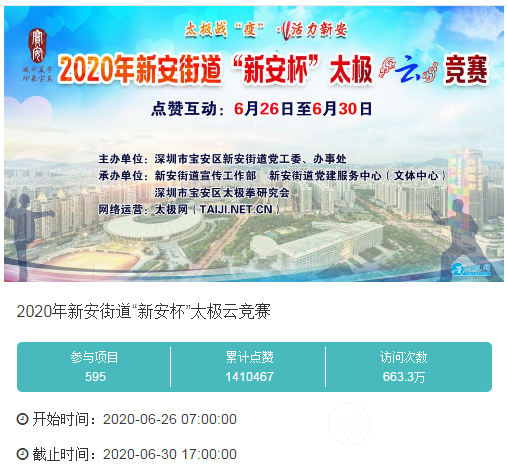为积极响应发展全民健身、建设健康中国的号召,同时为了倡导市民积极参与体育锻炼,强身健体、活跃身心,充分展示新安街道文化体育运动的蓬勃发展,特举办2020年新安街道“新安杯”太极云竞赛。 此次赛事由深圳市宝安区新安街道党工委、办事处主办,深圳市宝安区新安街道宣传工作部、深圳市宝安区新安街道党建服务中心(文体中心)、深圳市宝安区太极拳研究会承办,依托“互联网+太极拳”传播手段,创新传统武术传播模式。 6月30日下午,2020年新安街道“新安杯”太极云竞赛经过5天持续高能燃烧圆满收官。 大赛全体同台展播点赞从6月26日开始,截至30日17:00收官,平台累计网络访问量达663.3万次,投票点赞141万次,广大拳友们互动留言频繁刷屏,连续5天燃爆太极人的朋友圈!大赛通过网络向世界宣传和展示武术爱好者的英姿,充分彰显了新安街道文化体育运动的蓬勃发展。 本着"公开透明、客观全面、权威公正"的评审原则,在大赛展播点赞的网络基础上,组委会将邀请专业裁判员组成强大的评审阵容为大赛评审工作提供坚实保障,让大赛兼具观赏性和权威性。大赛评审结束后统一公示成绩,敬请期待。 2020年新安街道“新安杯”太极云竞赛组委会 |