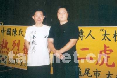 一九九四年参加中国温县国际太极拳年会推手擂台赛初露锋芒,一举夺得65公斤级冠军。随后屡战屡胜,蝉联河南省太极拳、剑推手比赛七十五公斤级冠军、全能冠军。中国温县国际太极拳年会推手擂台赛五次冠军,并在九八年全国武术锦标赛荣获八十公斤级推手冠军,成绩斐然。在探索太极拳奥妙与研究的同时,还致力于太极拳的传播和人才的培养,一九九七年创办太极拳培训中心,近年来为国内外培养千余名太极拳好手,多次应邀到国内外讲学、传授拳术。其学生曾多次参加国内外及省、市级各种规模的比赛, 获得金牌80余枚,银牌40余枚,铜牌60余枚。 陈二虎现被广东江门市太极拳联谊会、 广东台山联谊会聘为总教练和顾问。2002年,受人民体育出版社之邀,出版发行中华武术展现工程系列VCD《太极散手与擒拿》。