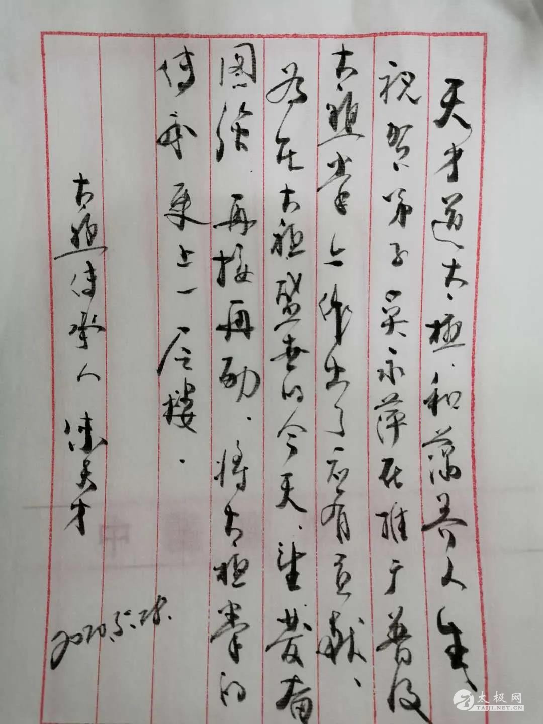 从左至右陈正雷、陈小旺、王西安、朱天才 吴永萍师承太极“四大金刚”之一的朱天才大师, 他在得知自己的弟子要推出《太极缠丝桩》课程后,很是欣慰,连夜奋笔疾书以表支持和高兴。