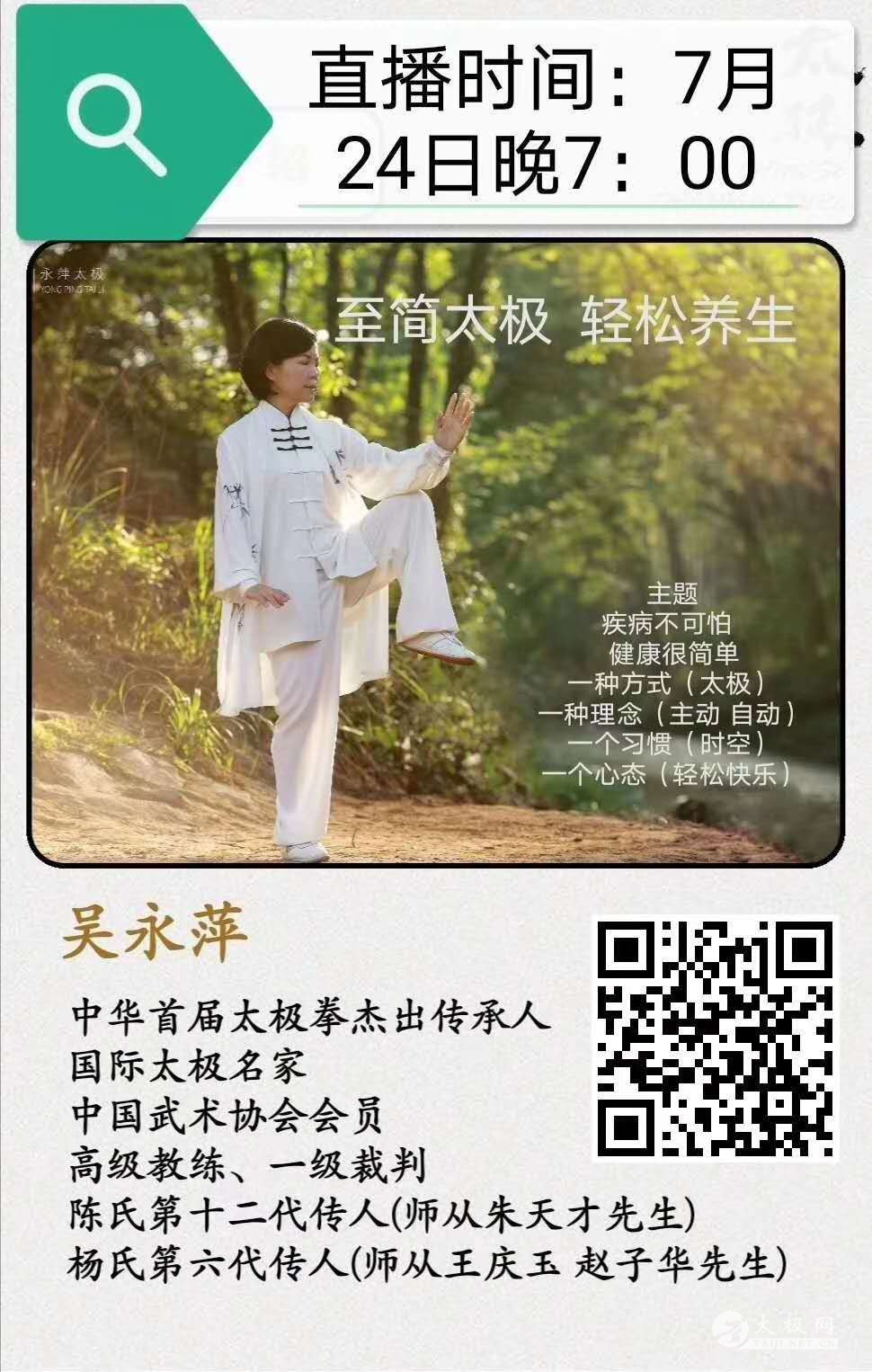 让生命回归自然! 疾病不可怕 健康很简单 一种方式(太极) 一种理念(主动 自动) 一个习惯(时空) 一个心态(放松自在) 2020年 7月24日(周五)晚7:00,吴永萍老师与大家相约直播间,共同探讨至简养生的秘密! 欢迎广大养生爱好者和太极文化爱好者届时收看互动!扫码进入直播间 |